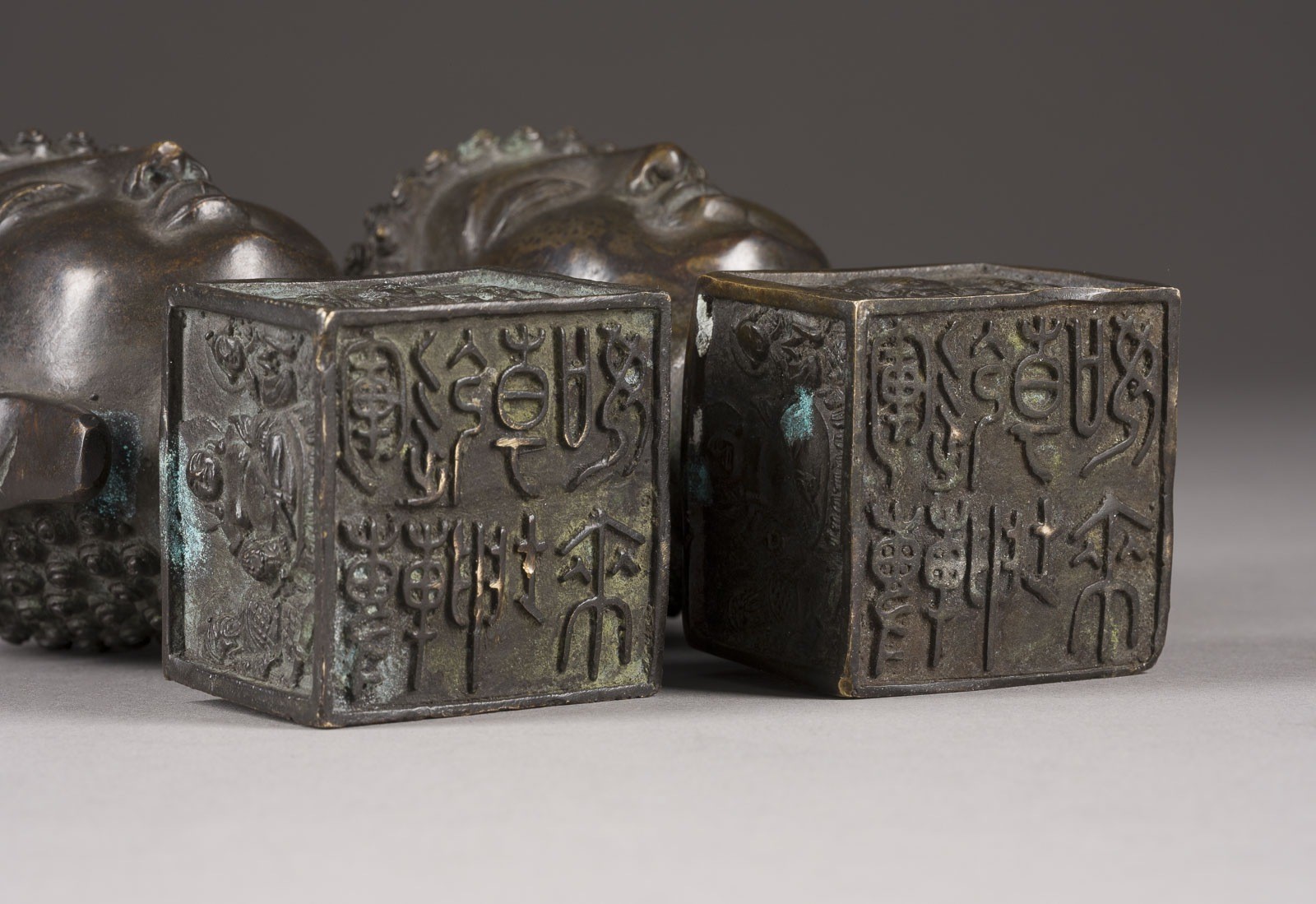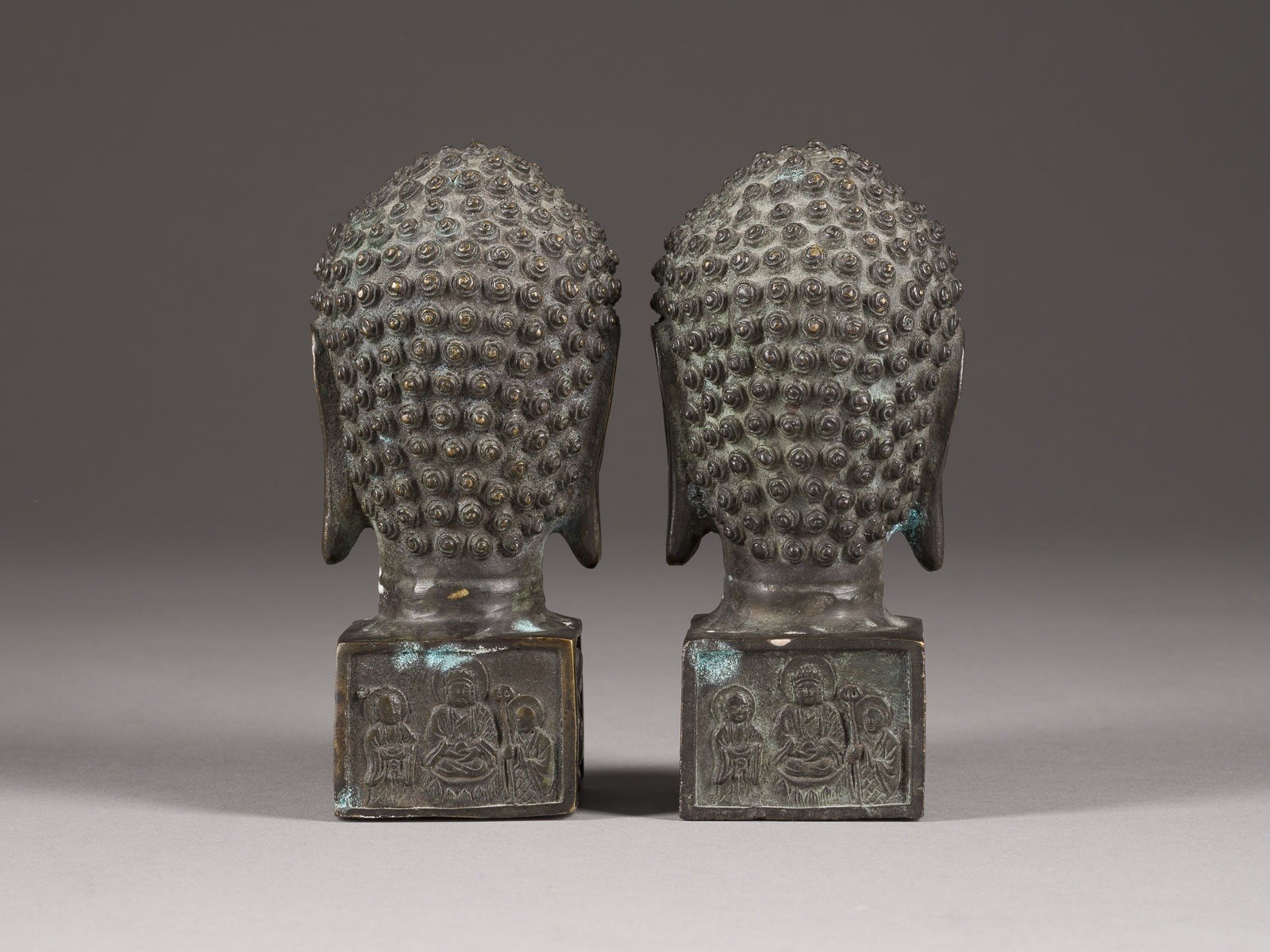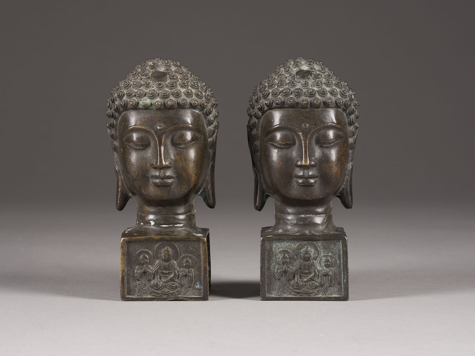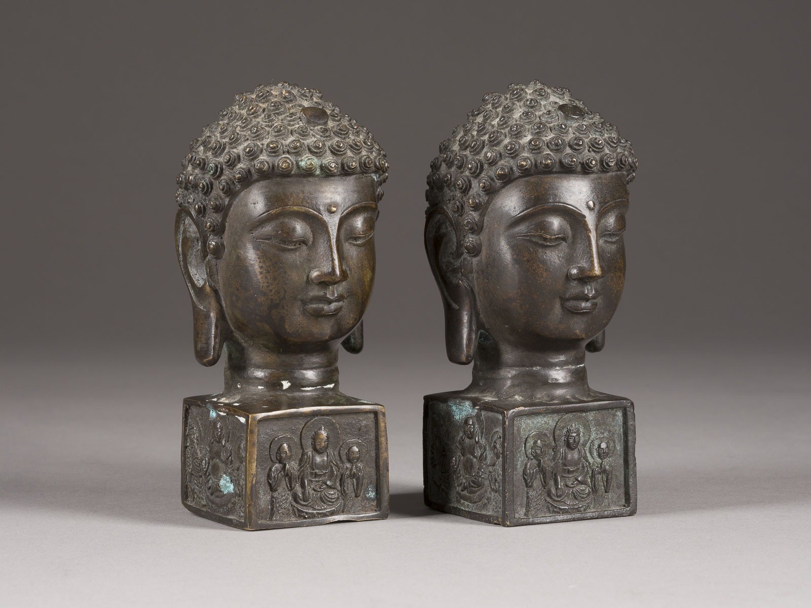 A PAIR OF BRONZE BUDDHA HEADS AS SEALS China Bronze. H. 13.2 cm. Each Buddha head is on a square base, with each side engraved with different representations of Guanyin and Buddha. The base is inscribed with seal characters. With traces of use and age, partially abraded and damaged.