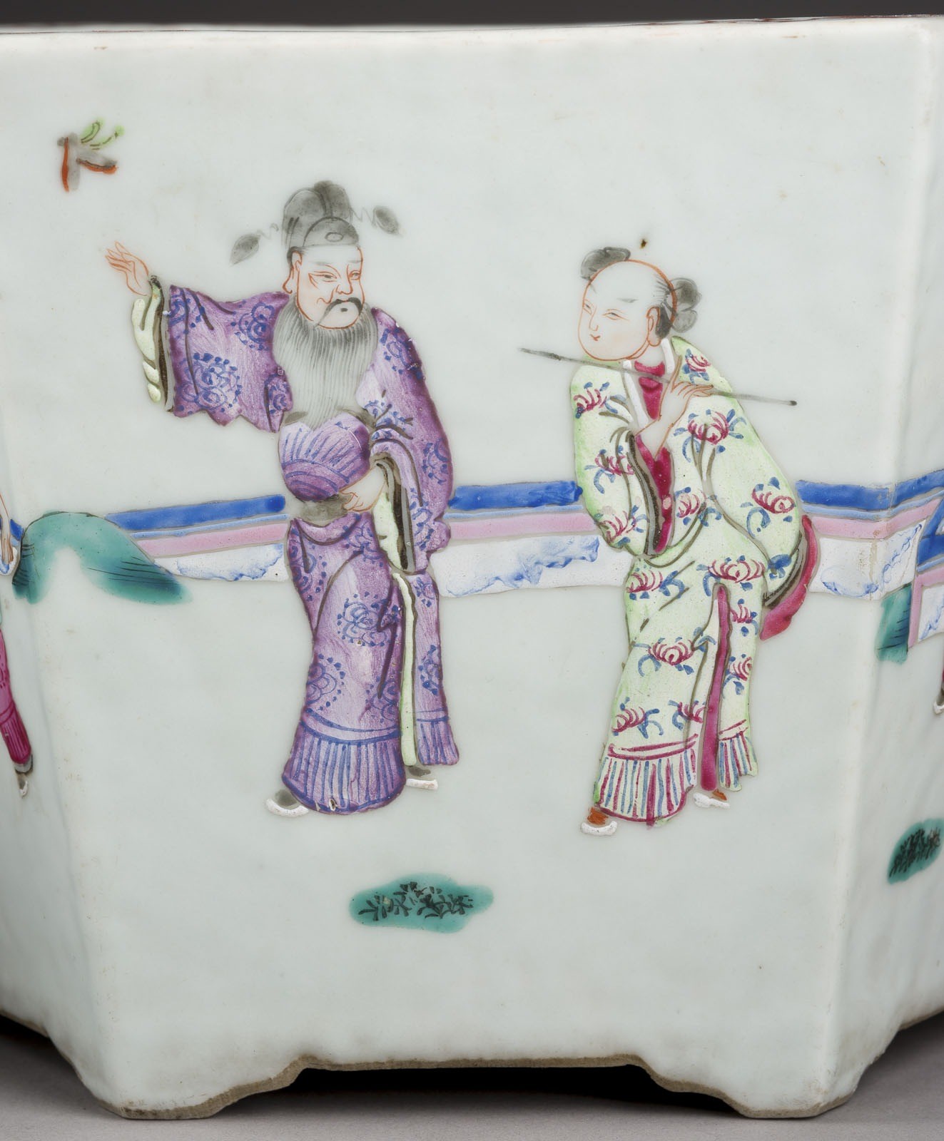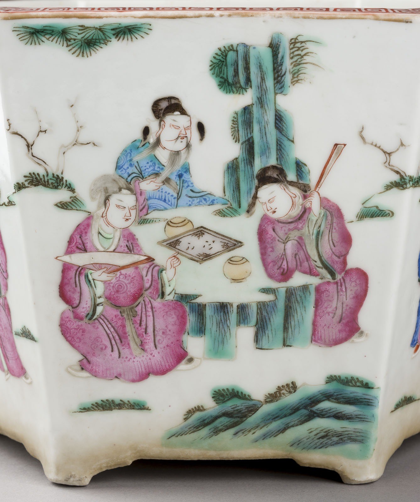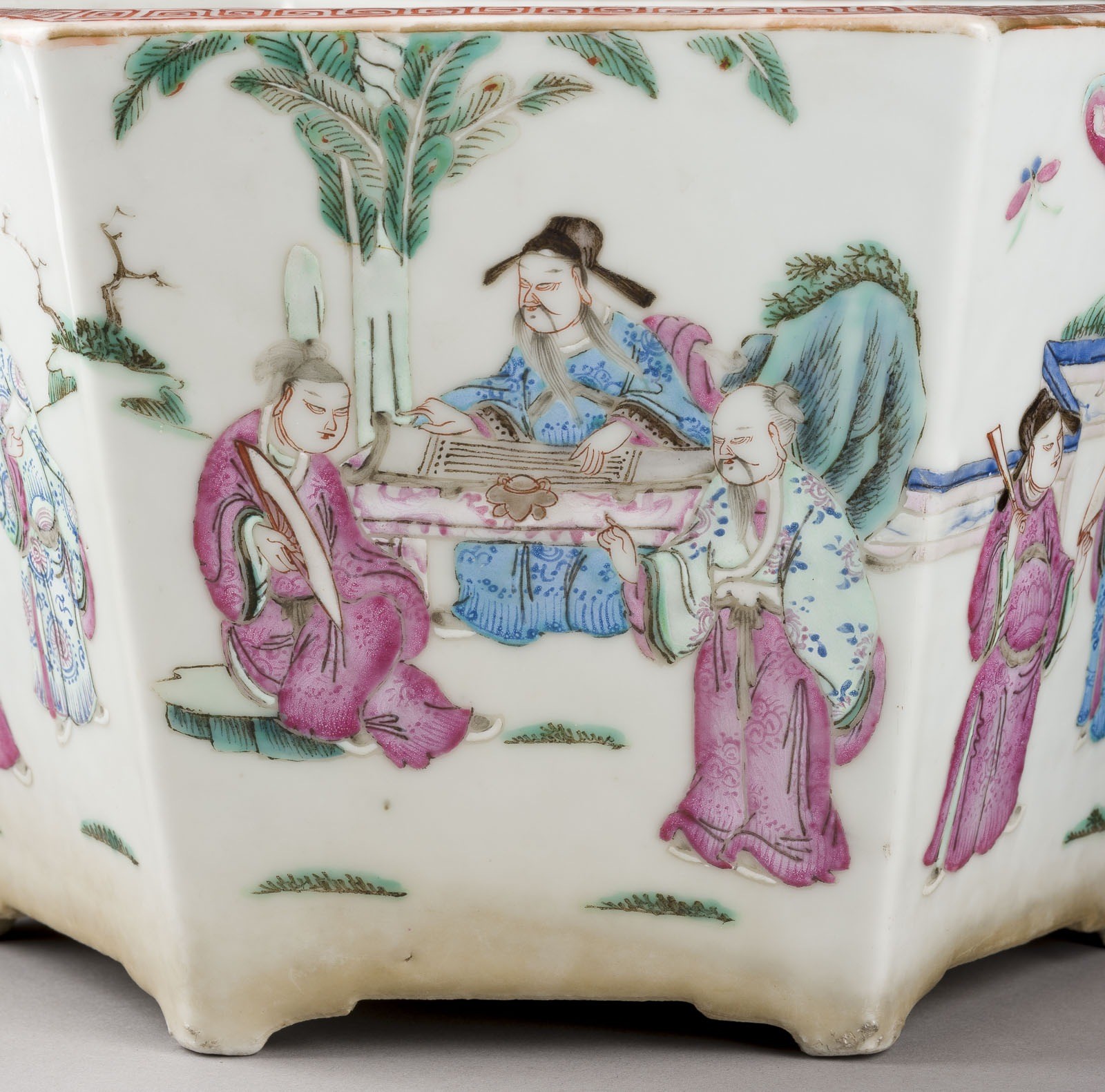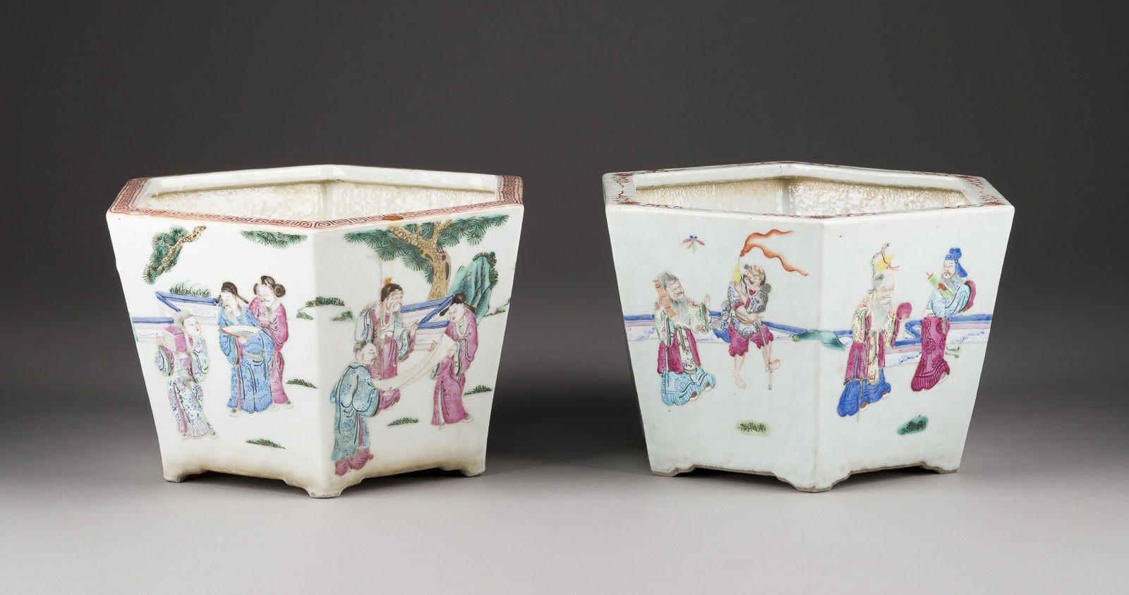 A PAIR OF FAMILLE ROSE 'FIGURAL' PLANTERS China, late Qing Dynasty Porcelain. H. ca. 16 cm. Comprising two hexagonal-shaped planters, one decorated with daily life scenes of scholars, the other decorated with a scene of the Eight Immortals Crossing the Sea (Baxian guo hai). With traces of age and use, partially abraded. Provenance: From a private collection in North Rhine-Westphalia.