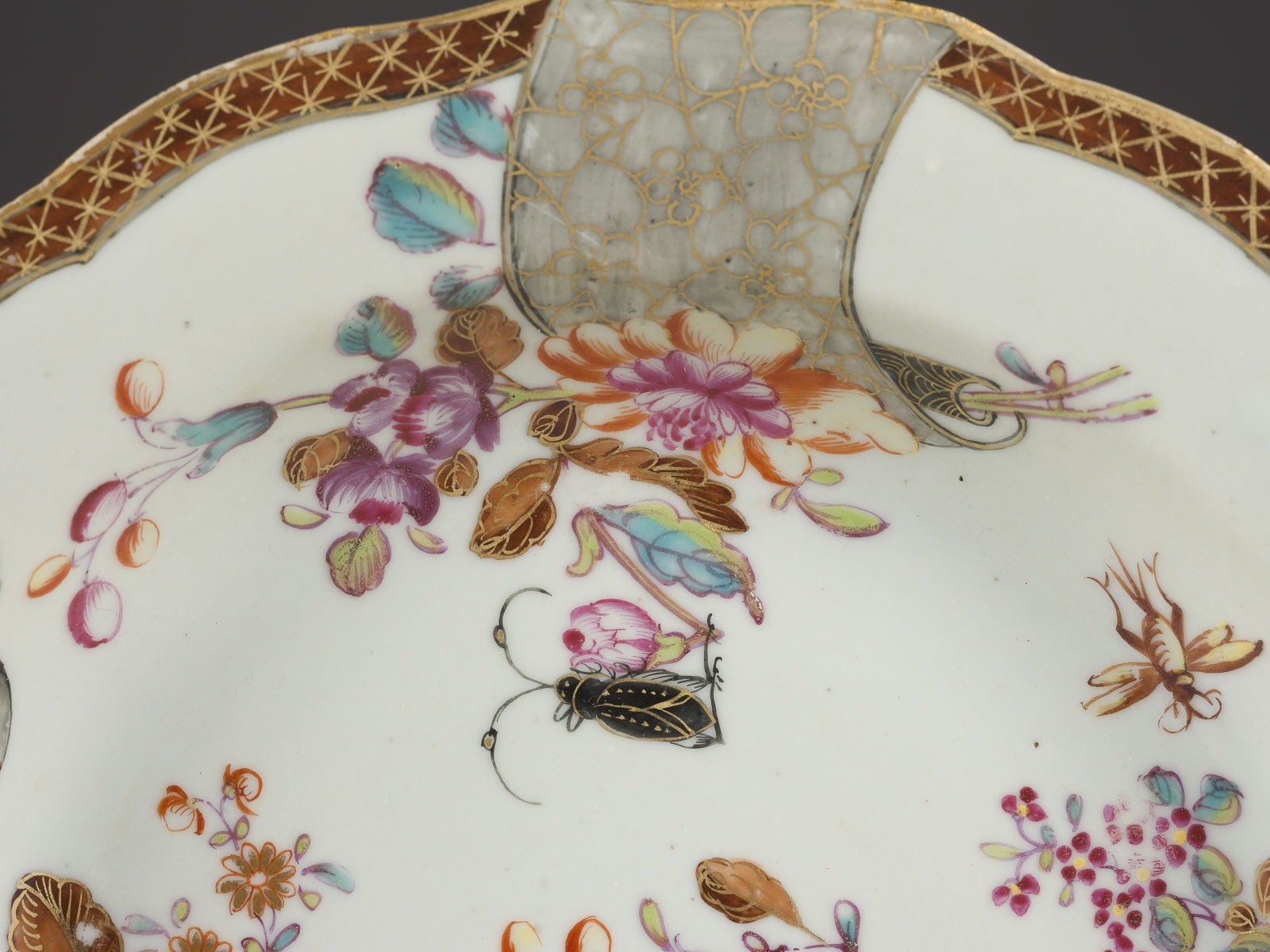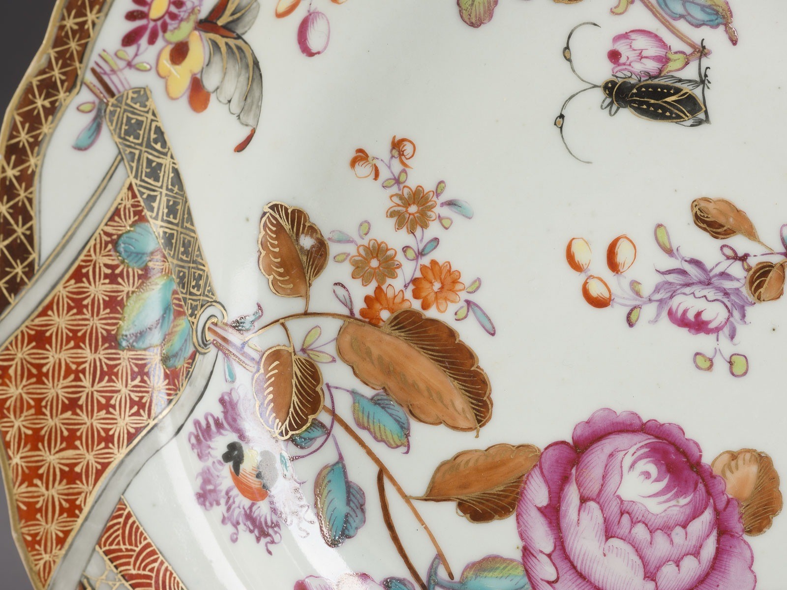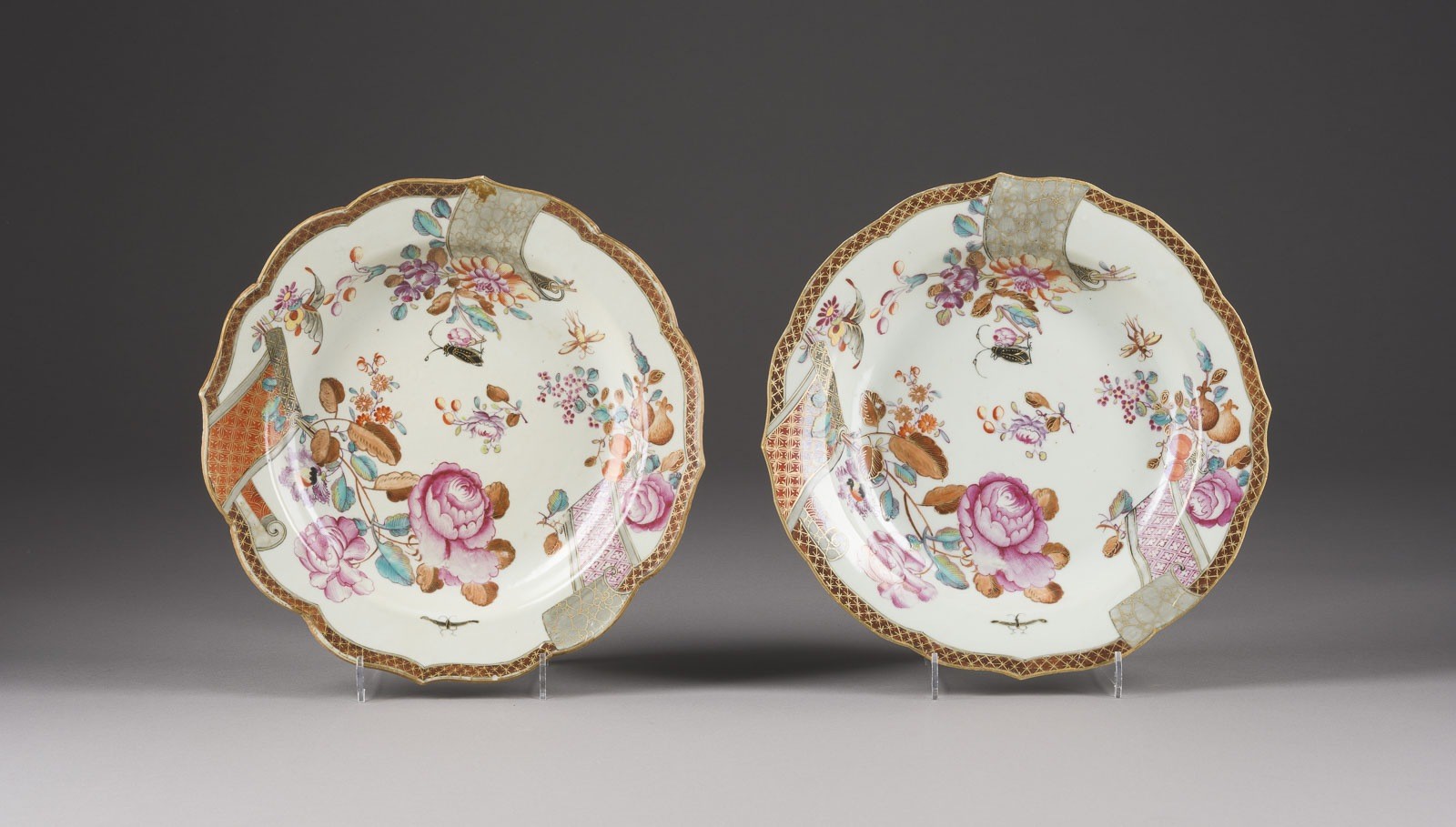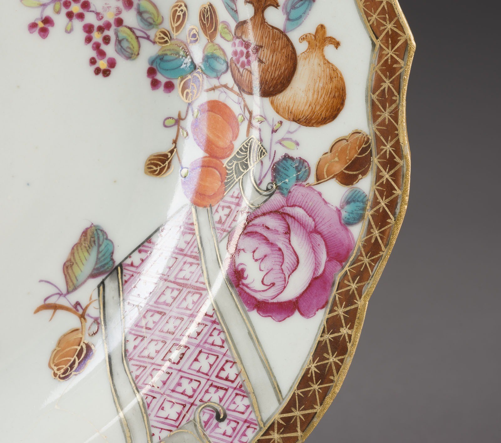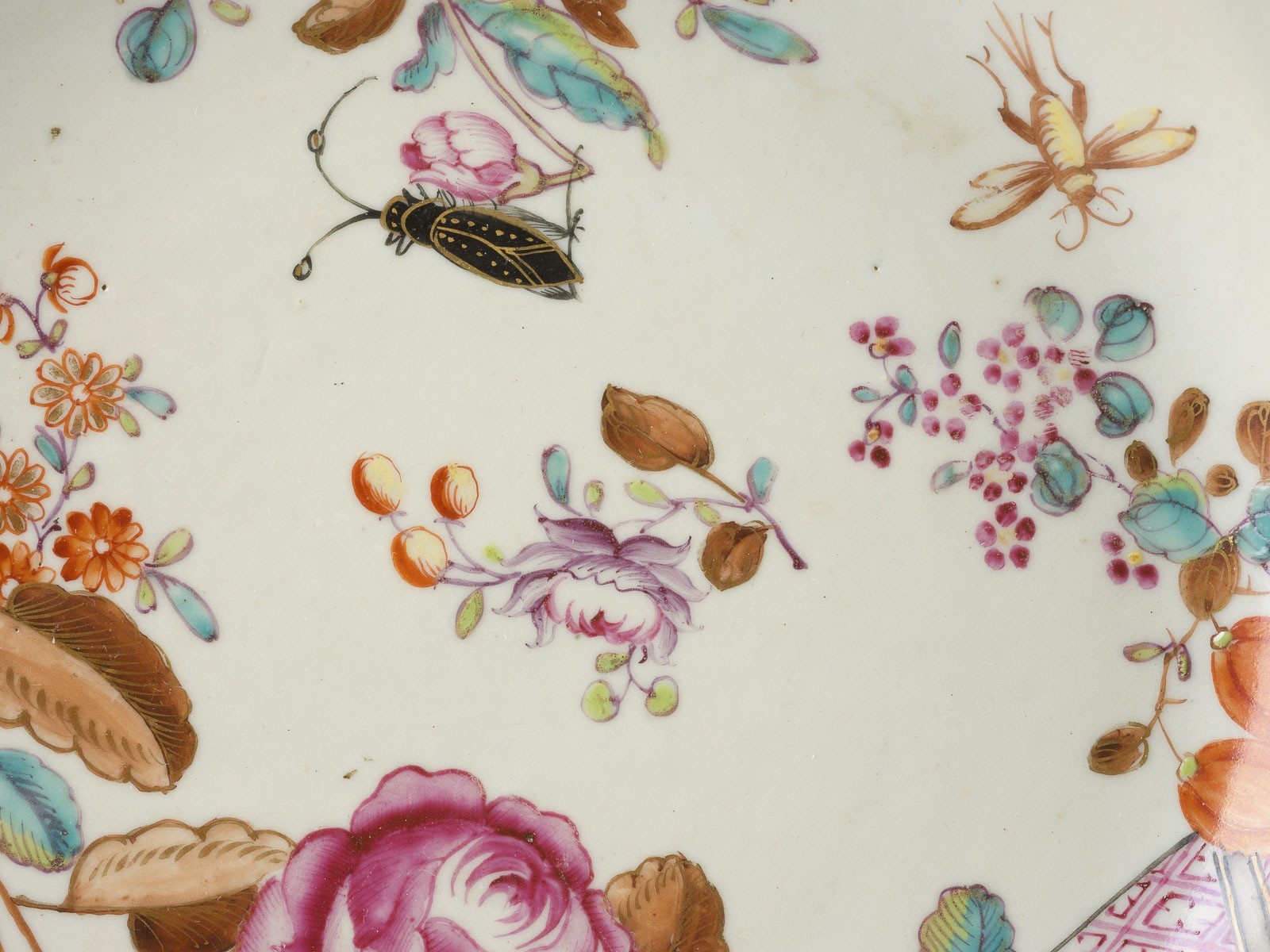 A PAIR OF FAMILLE-ROSE 'FLORAL' PLATES China, Mid-Qing Dynasty Porcelain. D. 23 cm. With traces of age and use, one plate damaged and restored. Provenance: From a German private collection.