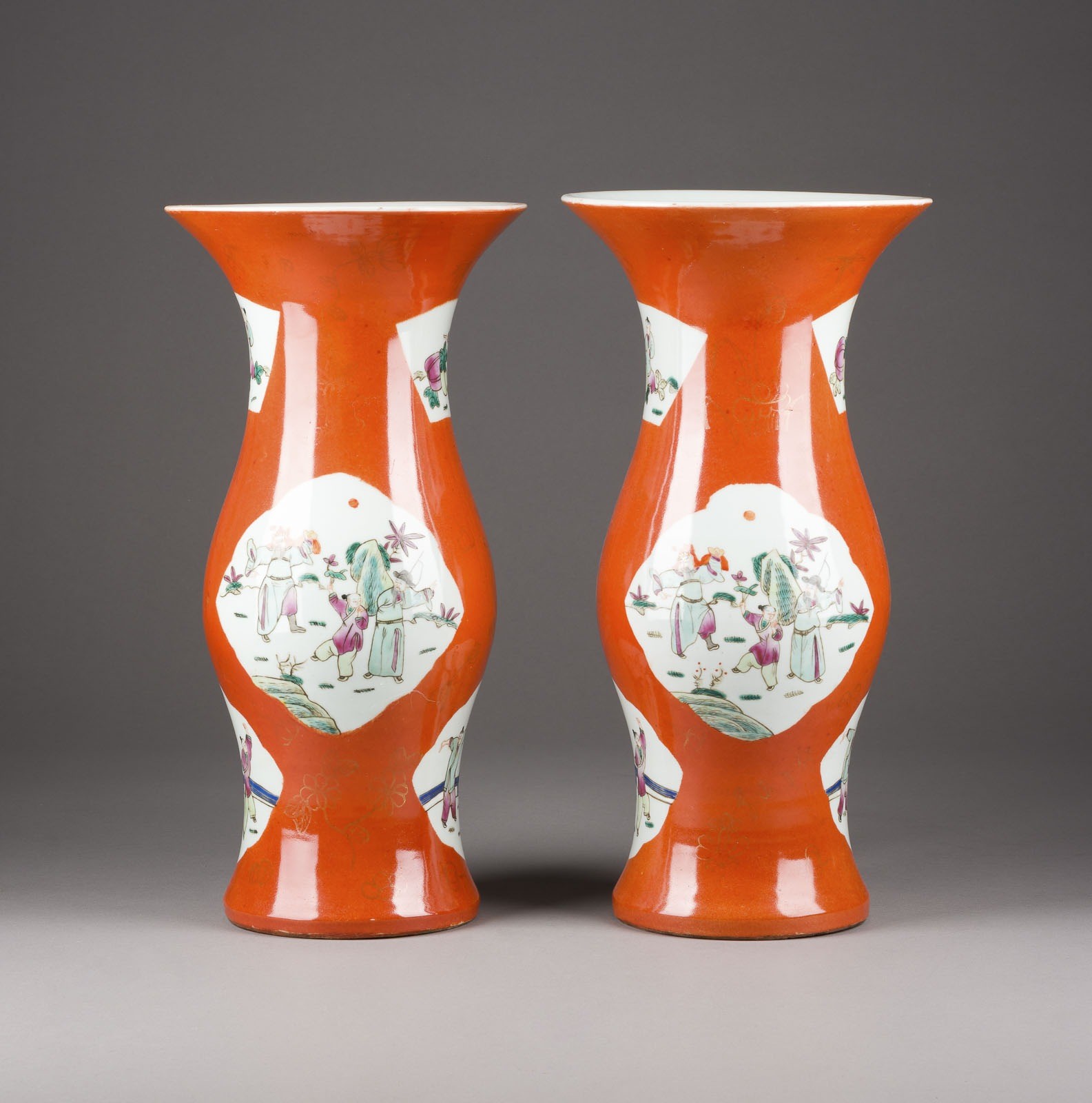 A PAIR OF FAMILLE-ROSE ORANGE-GROUND VASES China Porcelain. H. 36.5 cm. With traces of use.