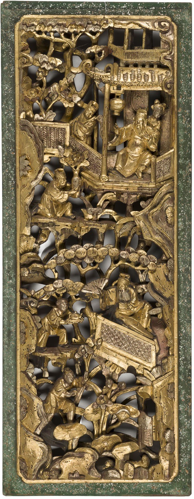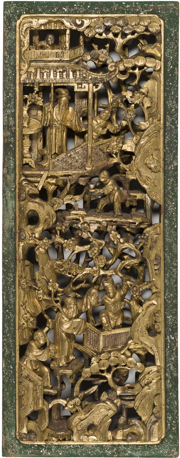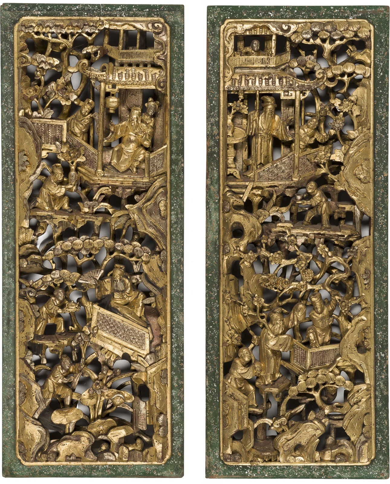 A PAIR OF GILT LACQUERED WOOD RELIEF PANELS China, 19th/20th century Wood. 77.5x30 cm. The relief depicts figural scenes. With traces of age, partially damaged and cracked.