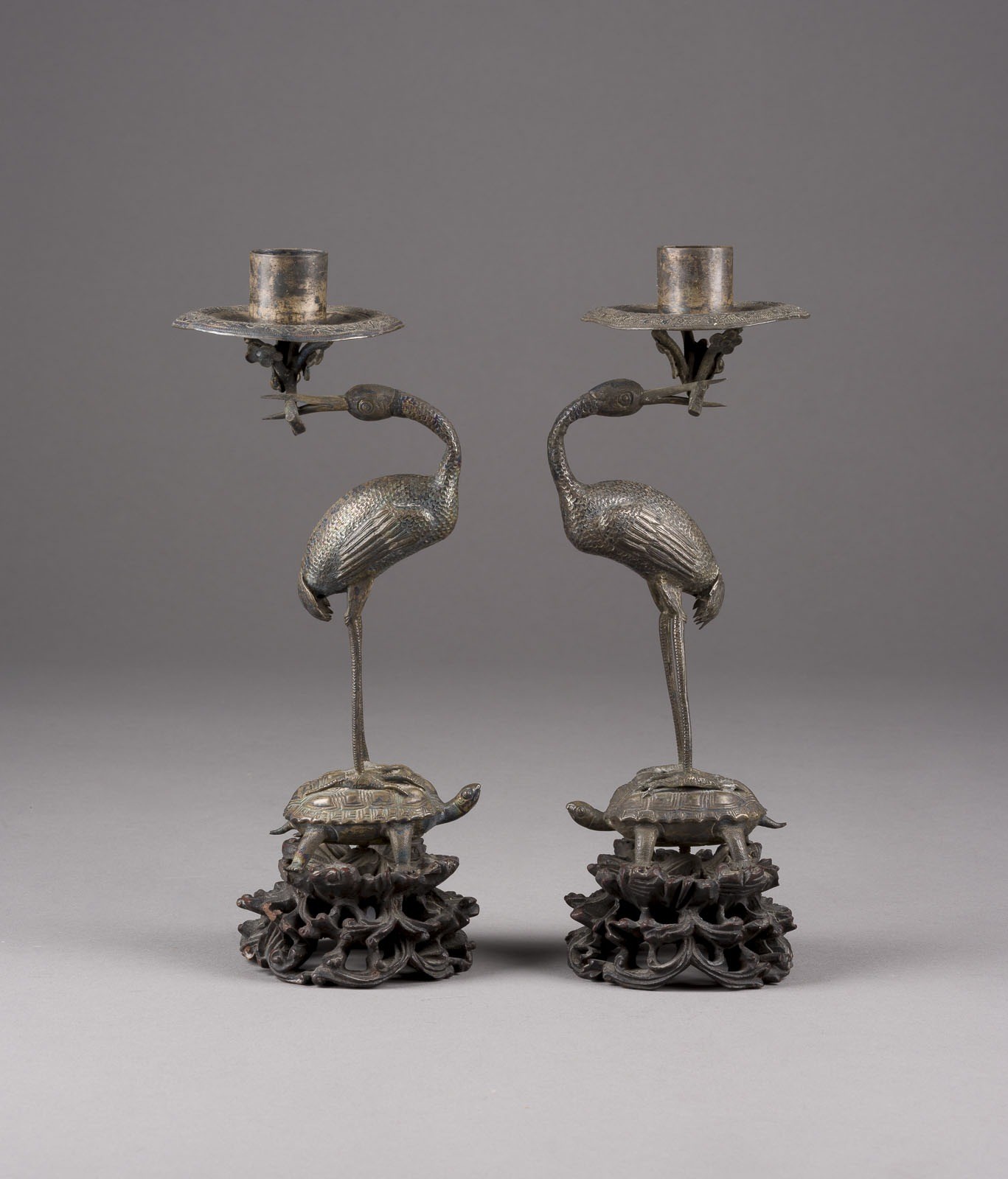 A PAIR OF CANDLESTICKS WITH CRANES AND TORTOISES China Silver. H. 23.3 cm; Total weight 392 g. With traces of age and use; one crane missing a toe, the other with damage to its wooden base.