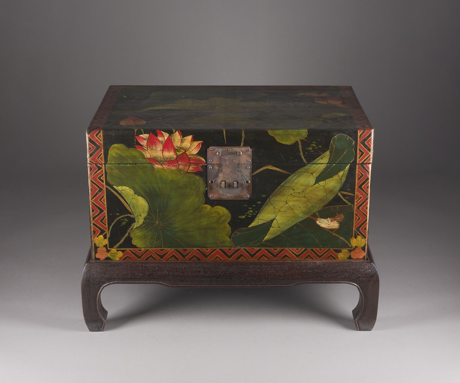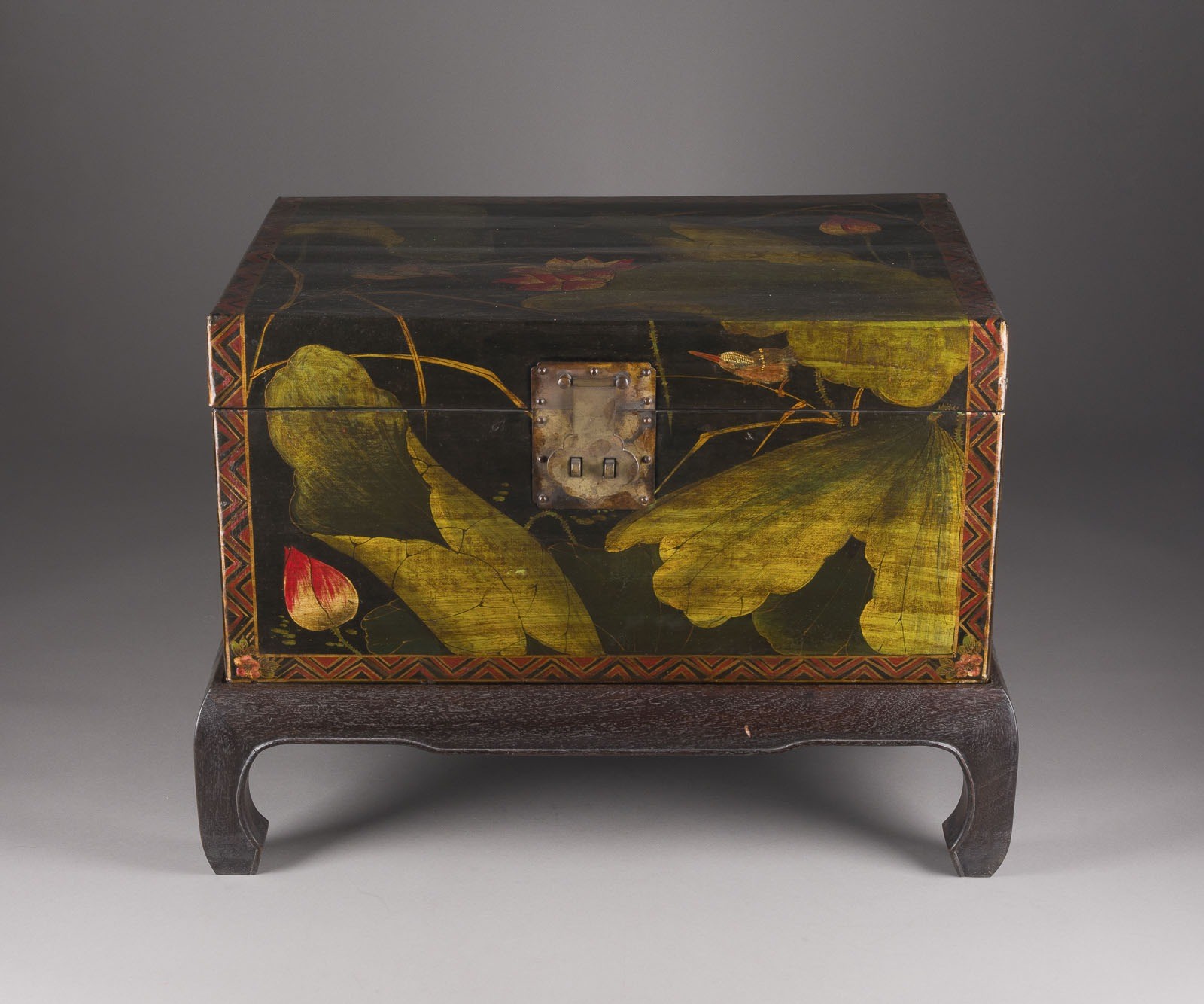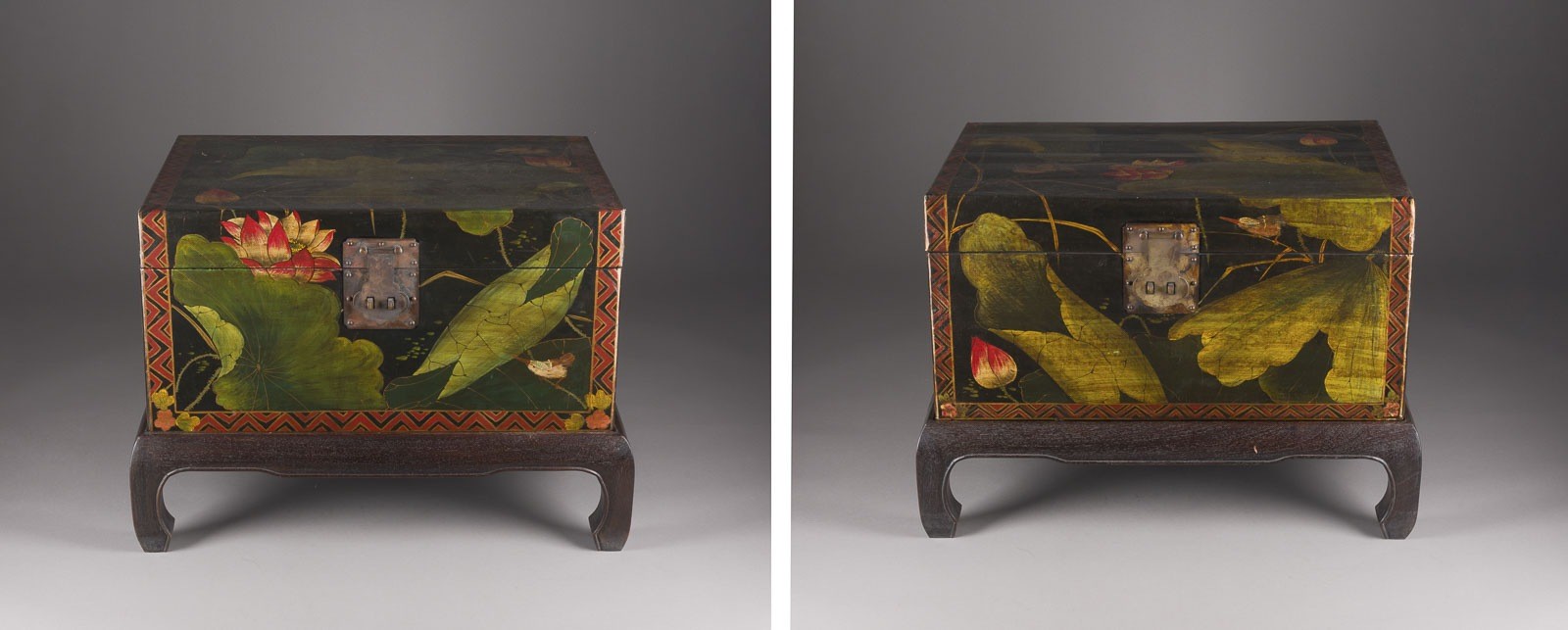 A PAIR OF BLACK LACQUERED WOOD 'FLORAL' TRUNKS China, 20th century Wood. H. 48 cm (with wooden stand). Both trunks are decorated with lotus flowers and leaves, each with a wooden stand. With traces of use and age, partially abraded, damaged and cracked.