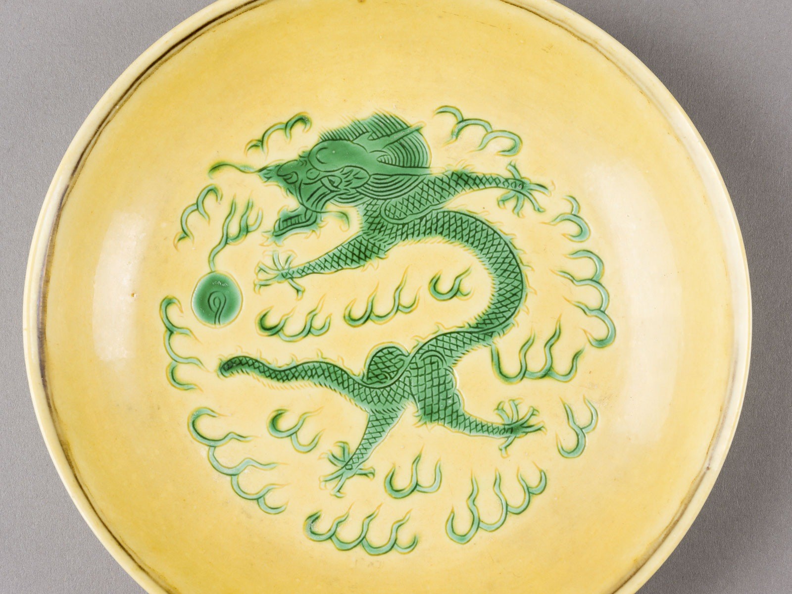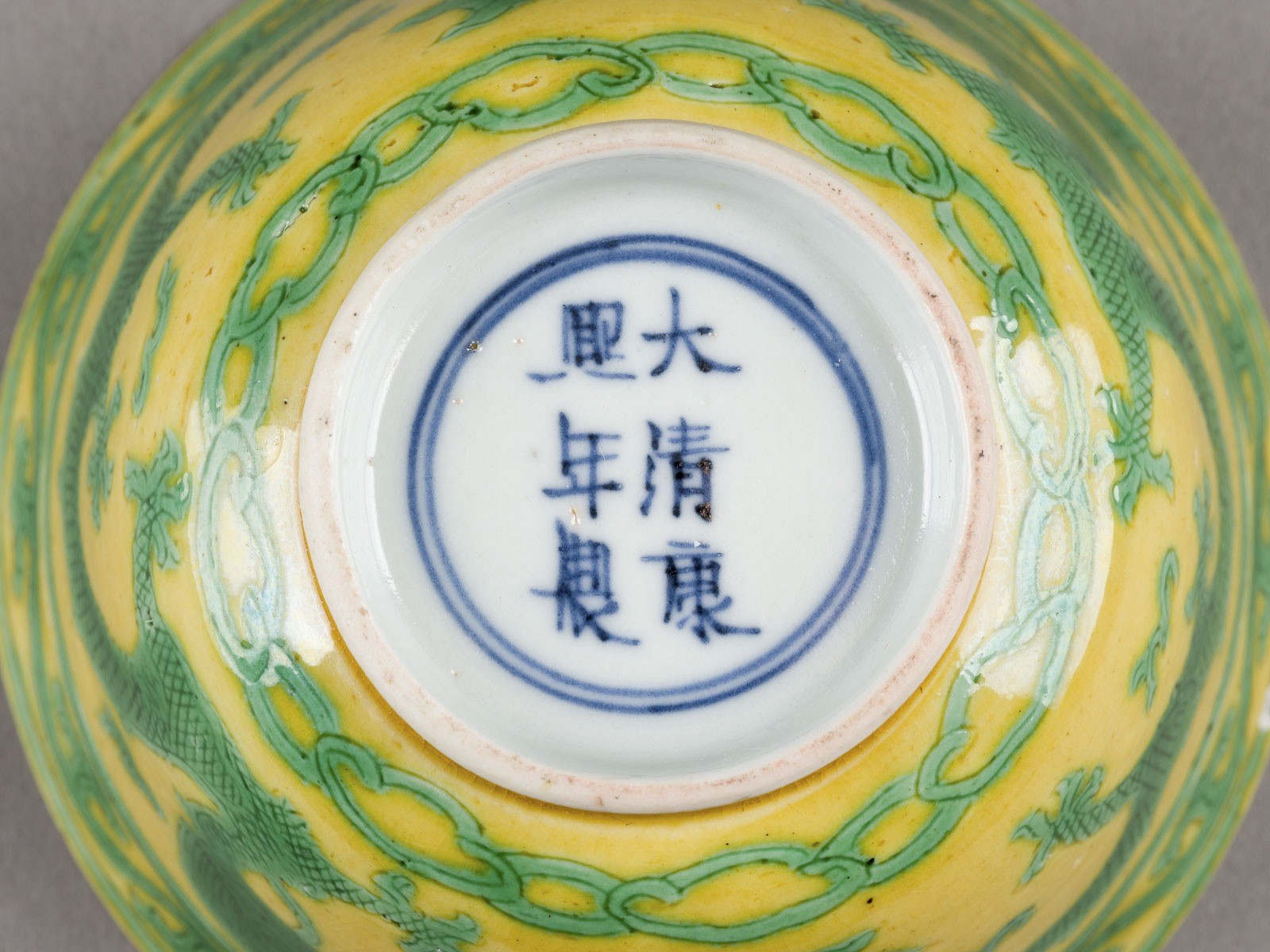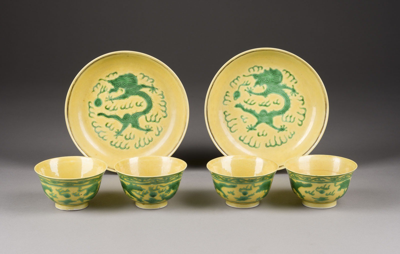 SIX YELLOW-GROUND GREEN-ENAMELLED 'DRAGON' CUPS AND DISHES China, late Qing Dynasty or later Porcelain. H. 5.3-5.6 cm (cups), D. 18 cm (dishes). Comprising four cups, each decorated to the interior with a "shou" character and to the exterior with two dragons chasing two flaming pearls, the base inscribed with a "Da Qing Kangxi Nian Zhi" mark; and two dishes decorated with a dragon, each with a "Qing Hua Zhen Pin" mark to the base. WMit Alters- und Gebrauchsspuren sowie einer kleinen Abplatzung am Rand einer der Tassen.