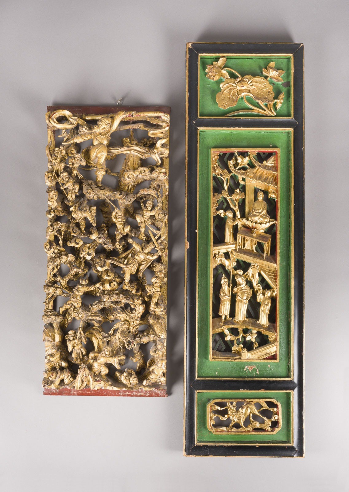 SEVEN GILT LACQUERED WOOD RELIEF PANELS China, 19th/20th century Wood. Ca. 12x21.5 cm-91x26cm. Including seven panels depicting figural scenes, with one panel illustrating a scene from the Journey to the West. With traces of age, partially abraded, damaged and cracked.
