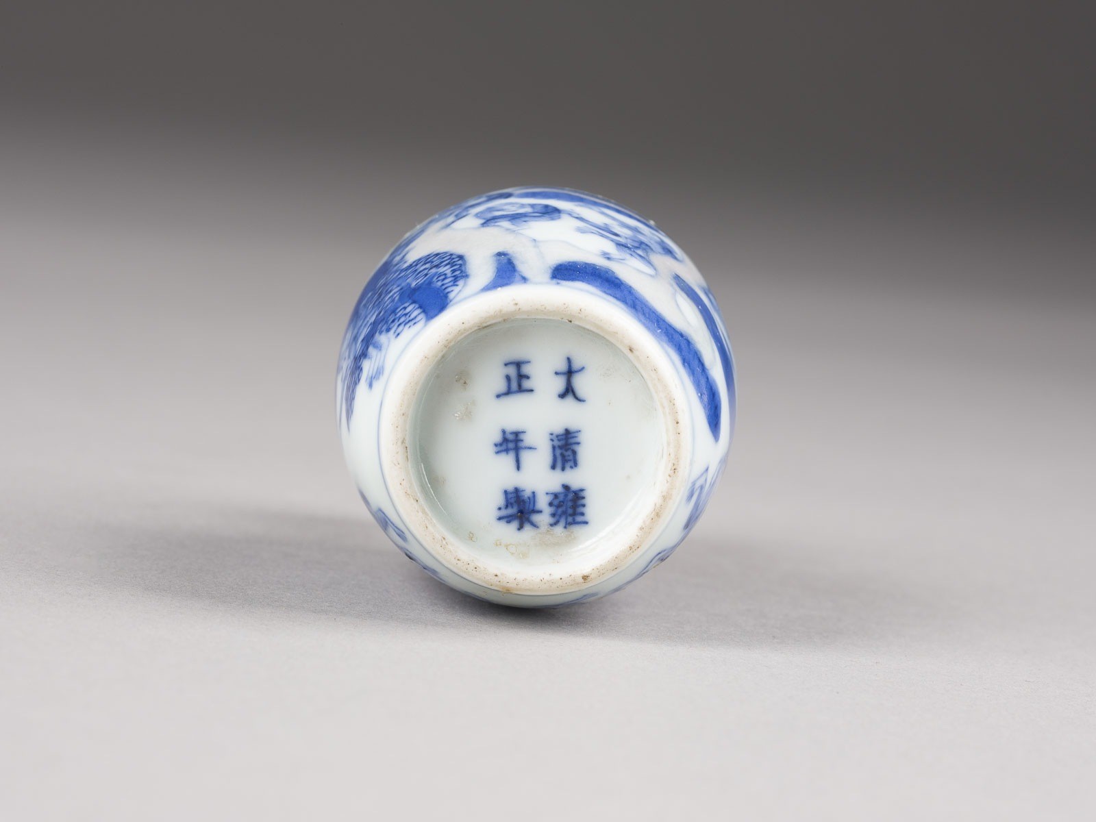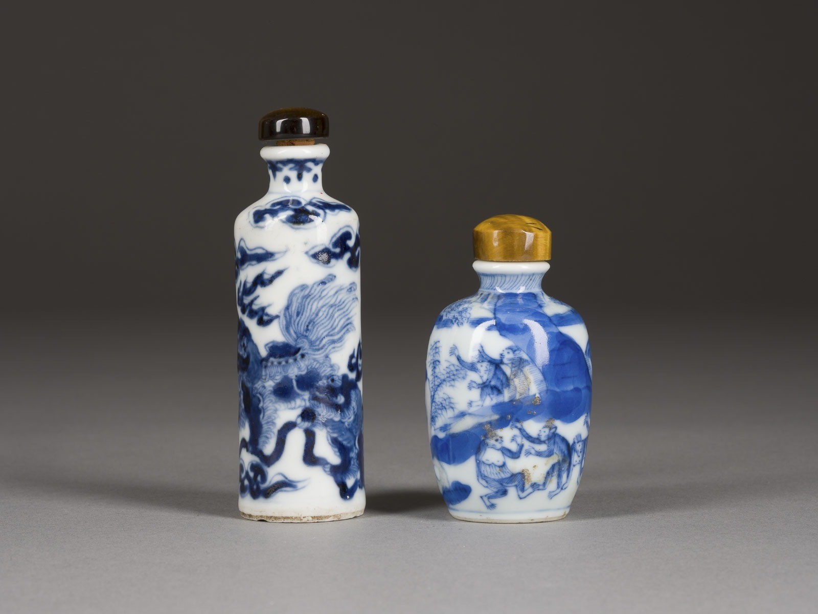 TWO BLUE AND WHITE 'ANIMAL' SNUFF BOTTLES China, Qing Dynasty Porcelain/Tigerite. H. 7.2-9.7 cm. Including a copper-red decorated blue and white snuff bottle depicting monkeys, with a mark "Da Qing Yongzheng nian zhi" to the base, and a blue and white snuff bottle depicting Buddhist lions, with a mark "Da Qing Qianlong nian zhi" to the base. Both fitted with tiger's eye stoppers. With traces of age and use, partially abraded; one chipped on the bottom.