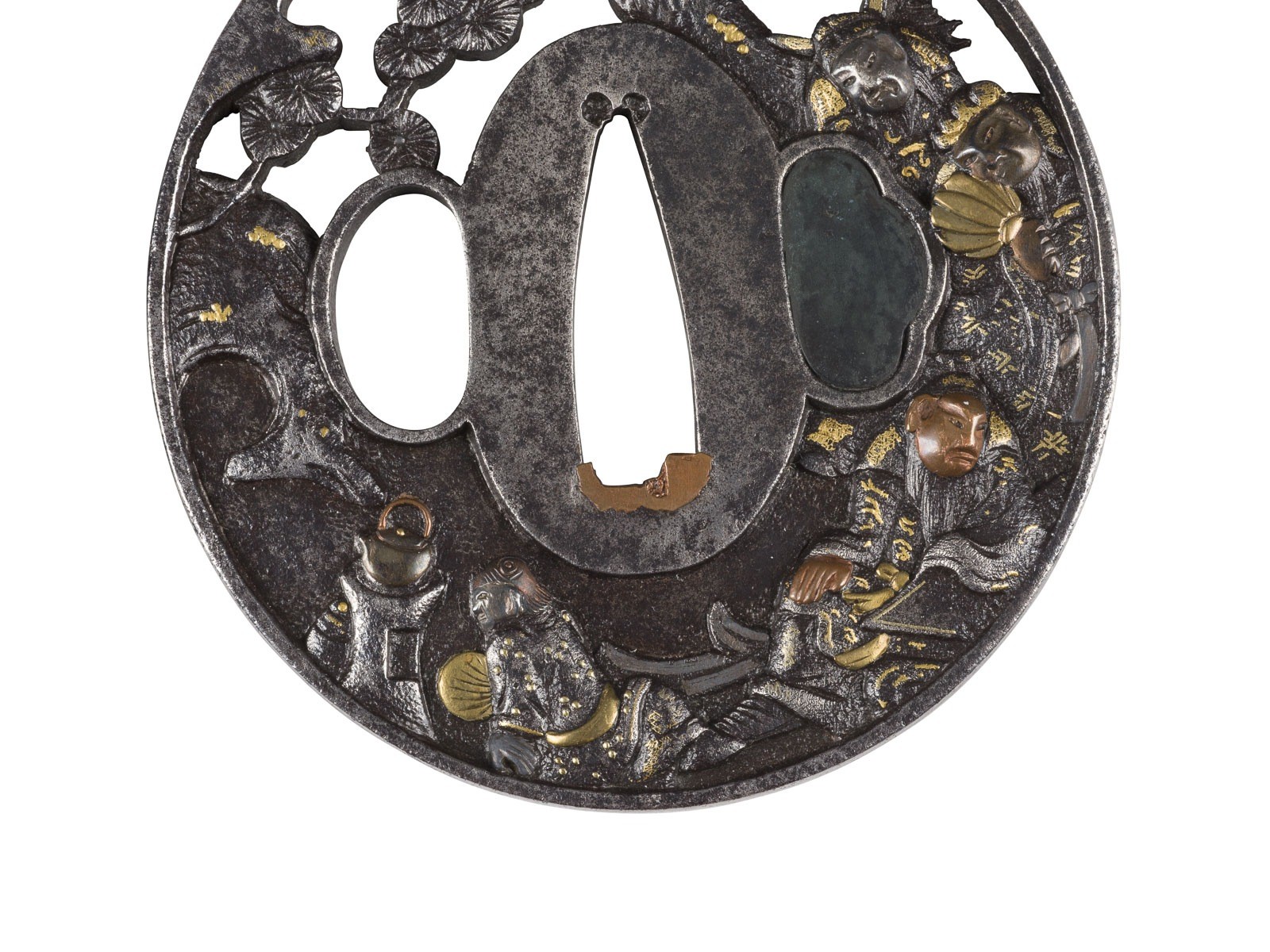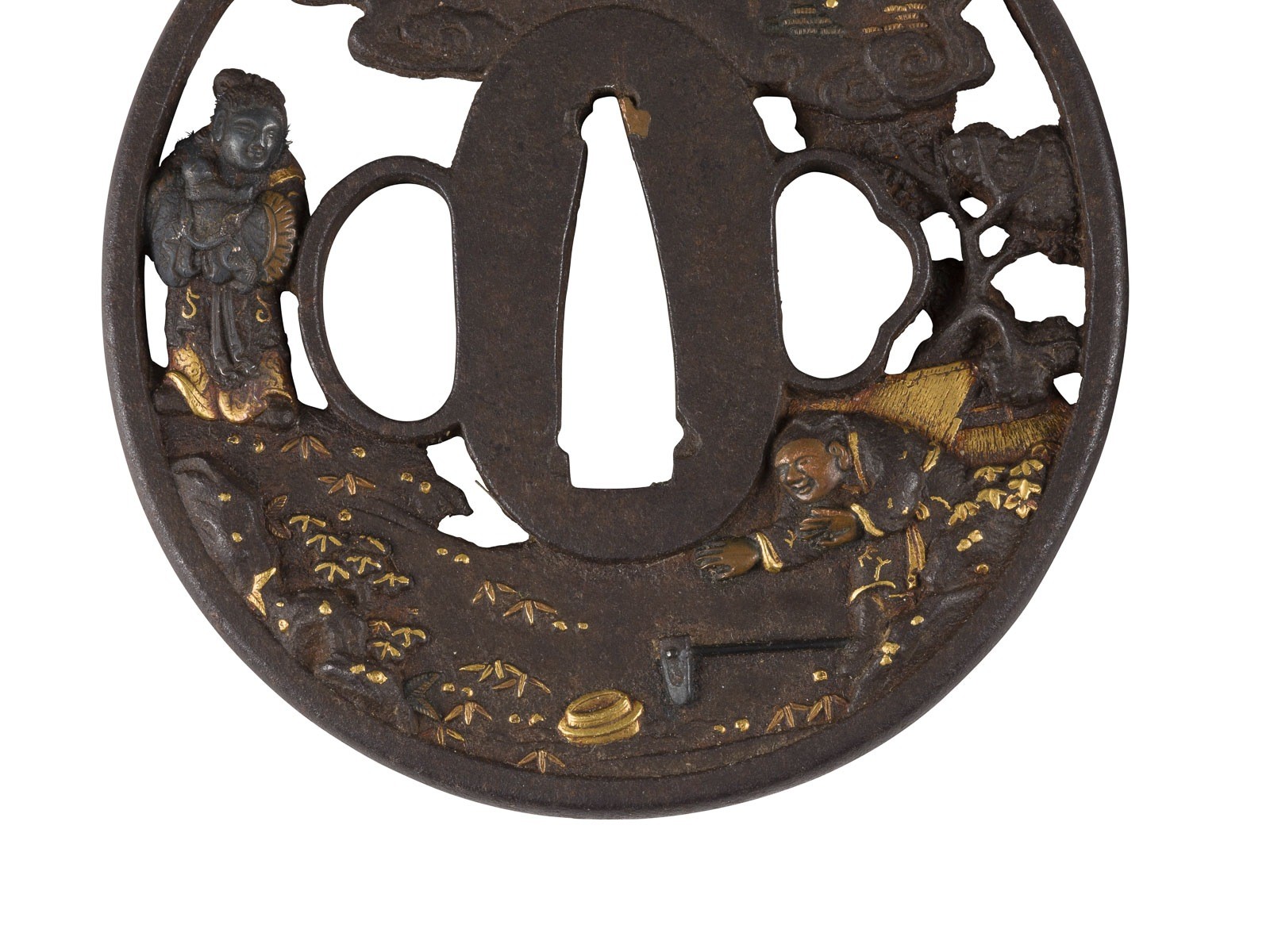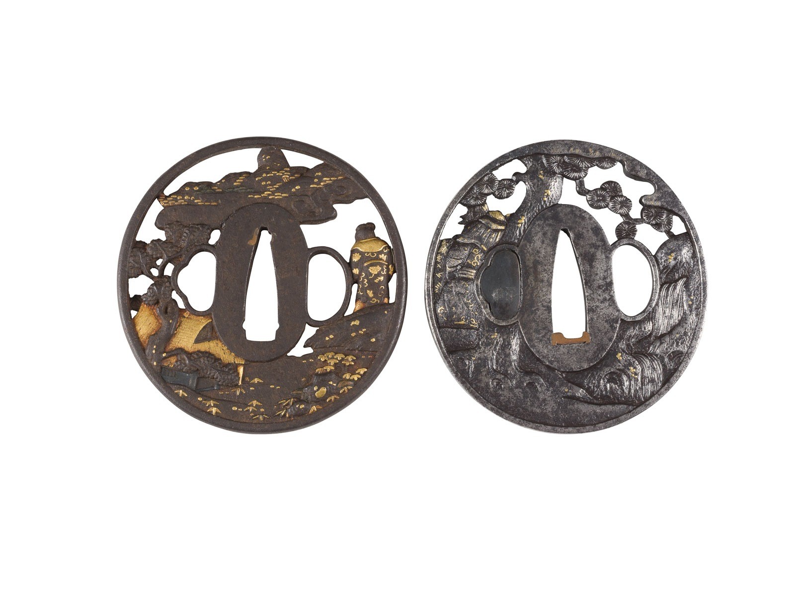 TWO INLAID TSUBA (SWORD GUARDS) Japan, 18th/19th century Iron. H. 7-7.2 cm. Including two sukashi-tsuba of marugata form, depicting figures, inlaid with shakudo, silver, and gold takazogan. With traces of age. Provenance: From an old private collection in North Rhine-Westphalia.