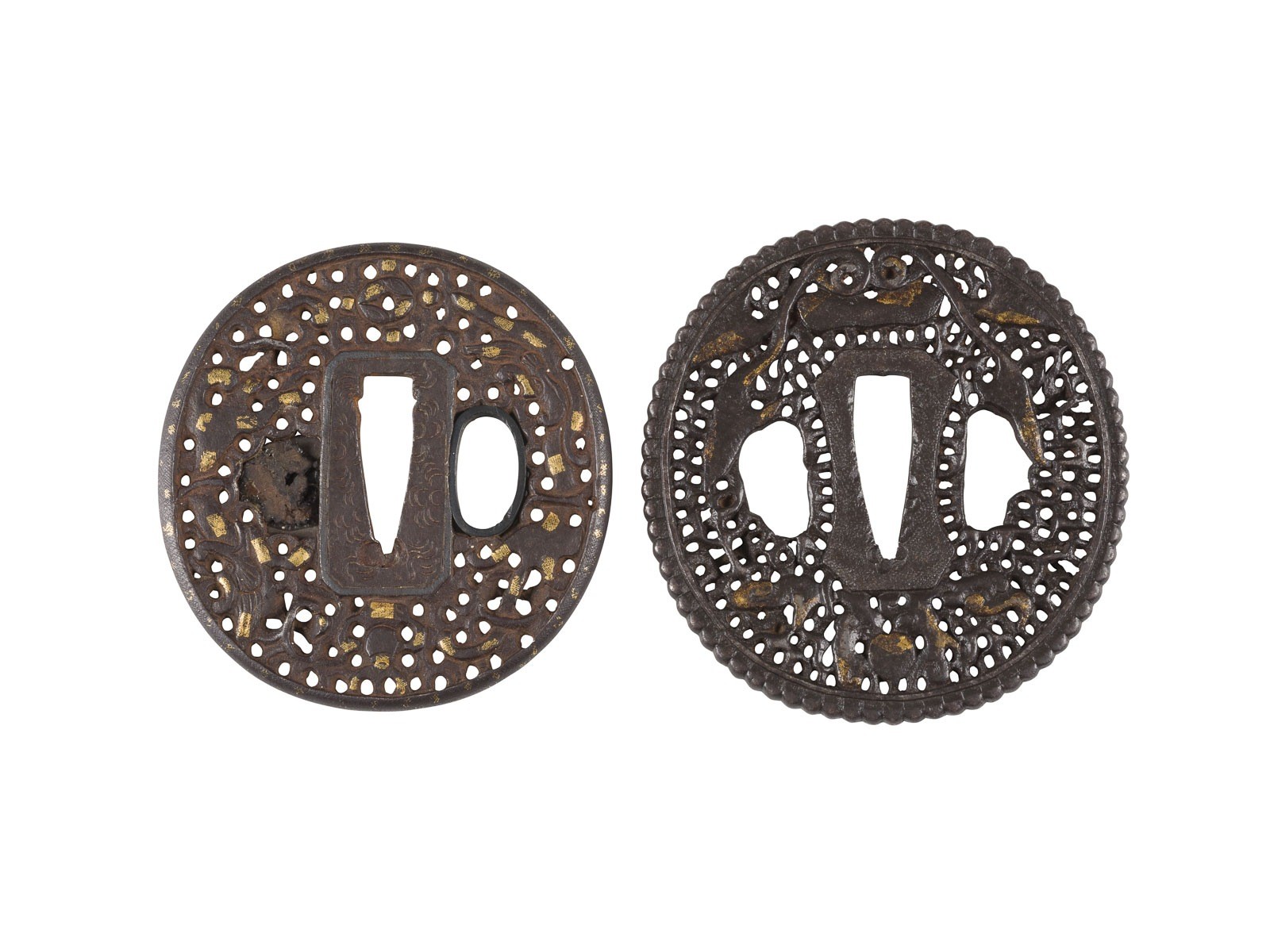 TWO IRON NANBAN TSUBA (SWORD GUARDS) Japan, 18th/19th century Iron. H. 6.8-7.4 cm. Including two tsuba of marugata form. With traces of age; one piece partially damaged. Provenance: From an old private collection in North Rhine-Westphalia.