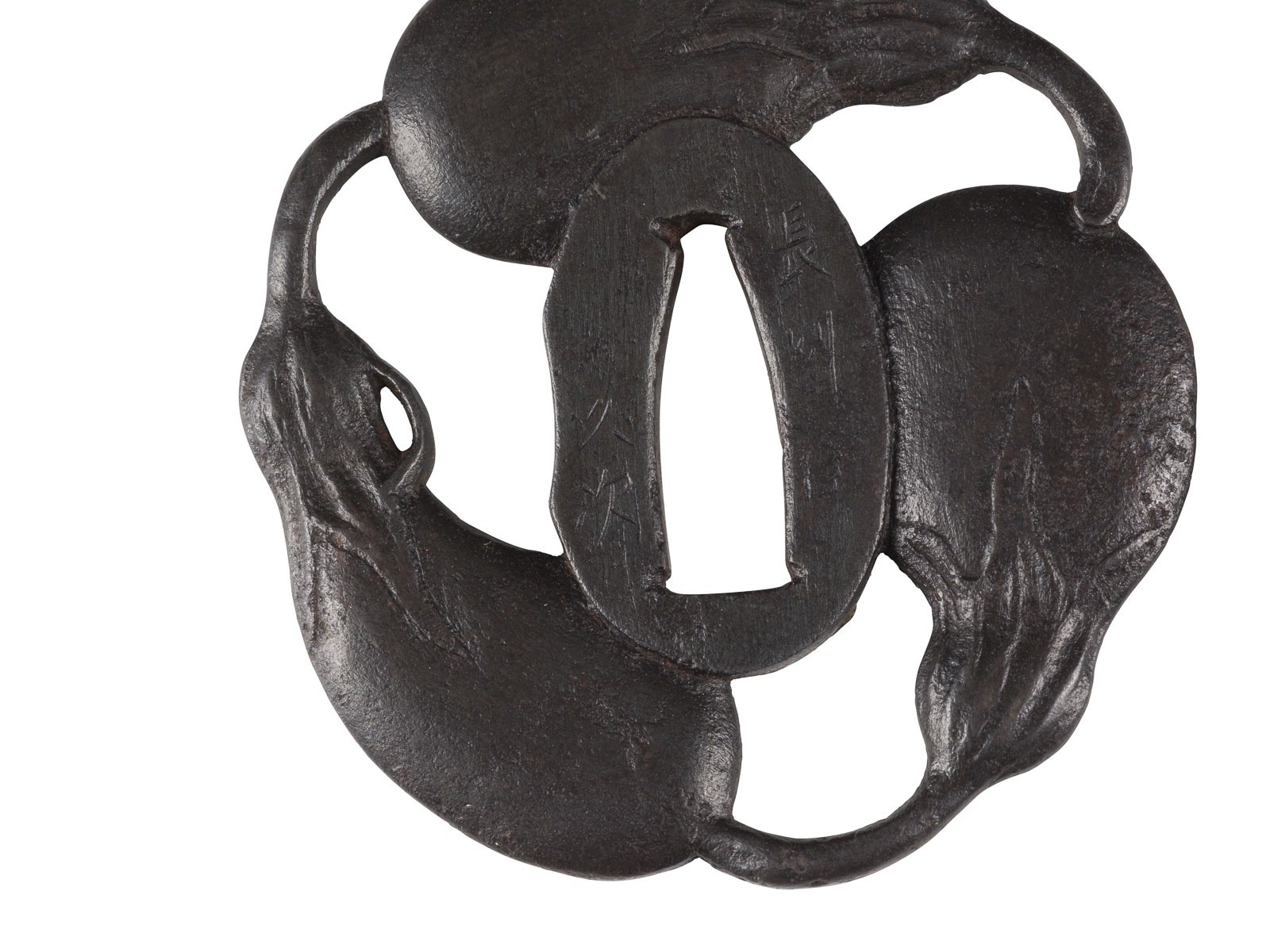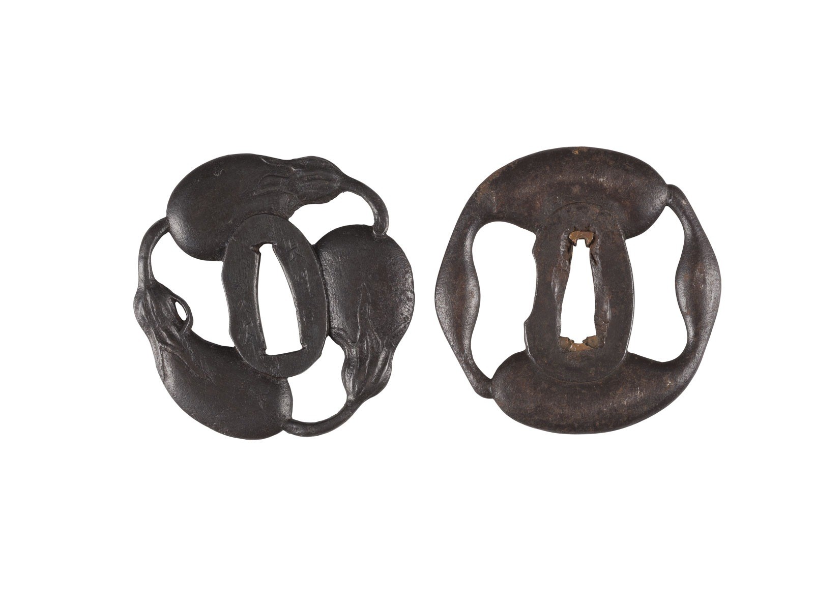 TWO IRON TSUBA (SWORD GUARDS) Japan, 18th/19th century Iron. H. ca. 7 cm. Both of marugata shape and finely worked in sukashi; one decorated with aubergines and signed "Choshu-ju Hisatsugu", the other with double gourds. With traces of age, partially abraded and damaged. Provenance: From an old private collection in North Rhine-Westphalia.