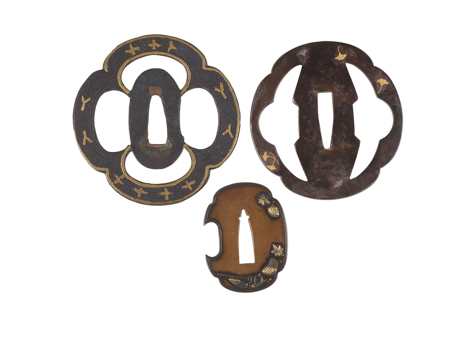 TWO IRON TSUBA AND A BRONZE TSUBA (SWORD GUARDS) Japan, 18th/19th century Iron. H. 5.1-8 cm. Including two iron sukashi-tsuba of mokkogata form, and a bronze tsuba of hamidashi form. With traces of age, partially abraded. Provenance: From an old private collection in North Rhine-Westphalia.
