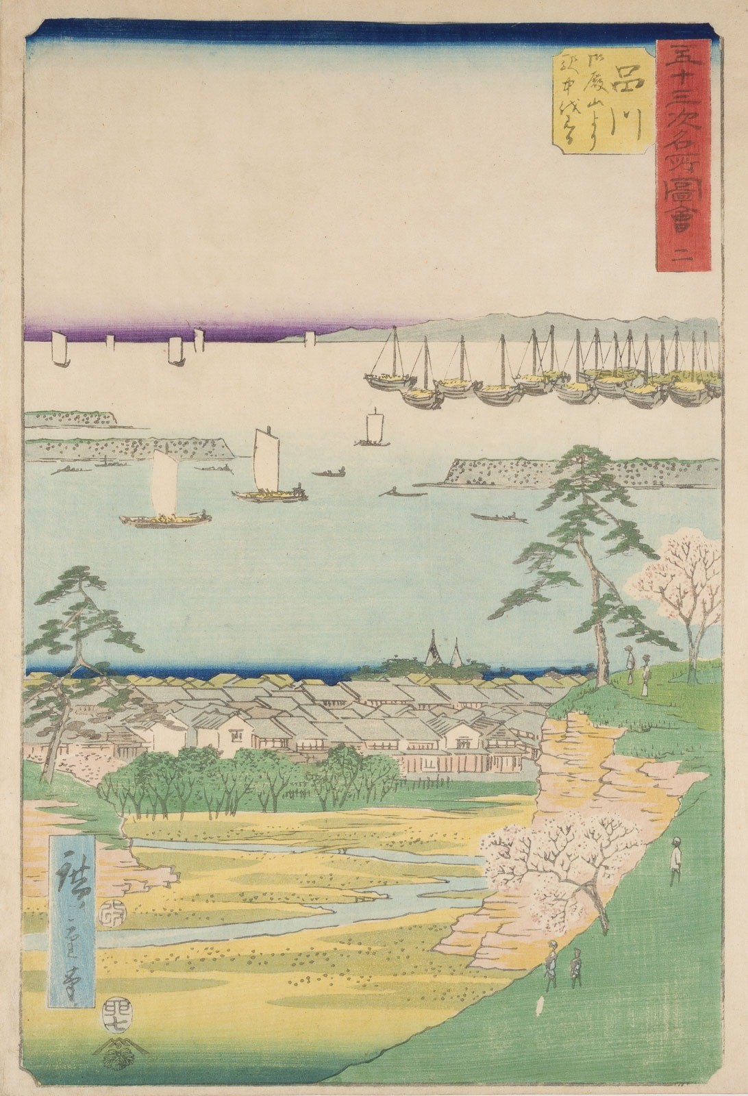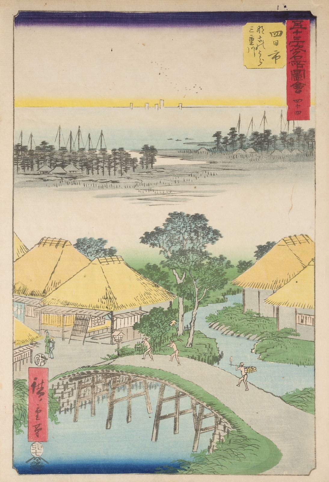 HIROSHIGE UTAGAWA 1797 - 1858 TWO UKIYO-E Japan, 1855 Woodblock print. 36x24.5 cm. Including "Yokkaichi Nagonoura, Mie-gawa" (Yokkaichi - Nago Bay, Mie River), No. 44 from the series "Gojusan tsugi meisho zue" (Illustrated Guide to Famous Places along the Fifty-three Stations), and "Shinagawa", No. 2 from the same series; both signed Hiroshige hitsu, with censor's seal aratame, Hare 7, published by Tsutaya Kichizo (Koeido). With traces of age.