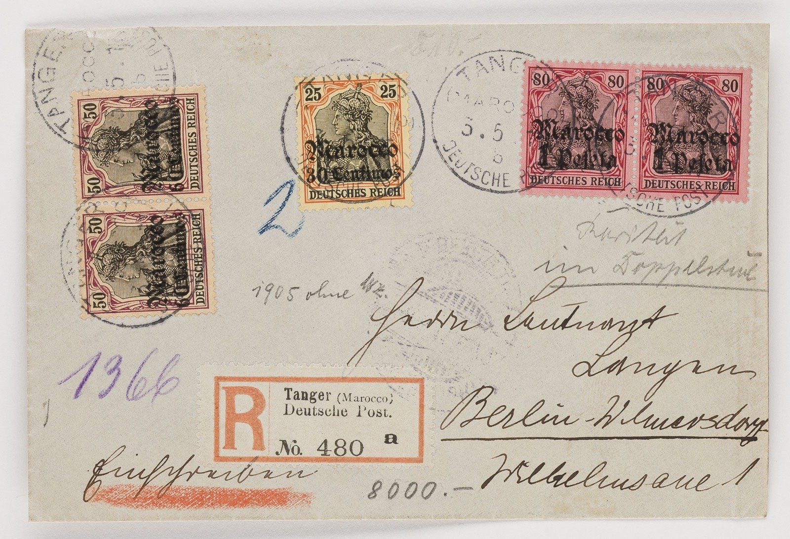 Marokko Einschreibebrief der Deutschen Post in Marokko, Aufgabe Tanger, adressiert nach Berlin-Wilmersdorf, befördert 1911. Frankiert mit Mehrfach- und Mischfrankatur aus Marken des Deutschen Reiches mit Aufdruck "Marocco" und Wertangabe, bestehend aus: 2 × 50 Pf Germania (vertikal geklebt), 1 × 25 Pf Germania und 2 × 80 Pf Germania. Sauber entwertet mit TANGER / MAROCCO / DEUTSCHE POST-Stempeln, teils mehrfach und klar abgeschlagen. Vorderseitig roter R-Einschreibzettel 'Tanger (Marocco) Deutsche Post. No 480 a, verso Kreisstempel 'WILMERSDORF b.BERLIN 8.5.11. 6-7V.'
