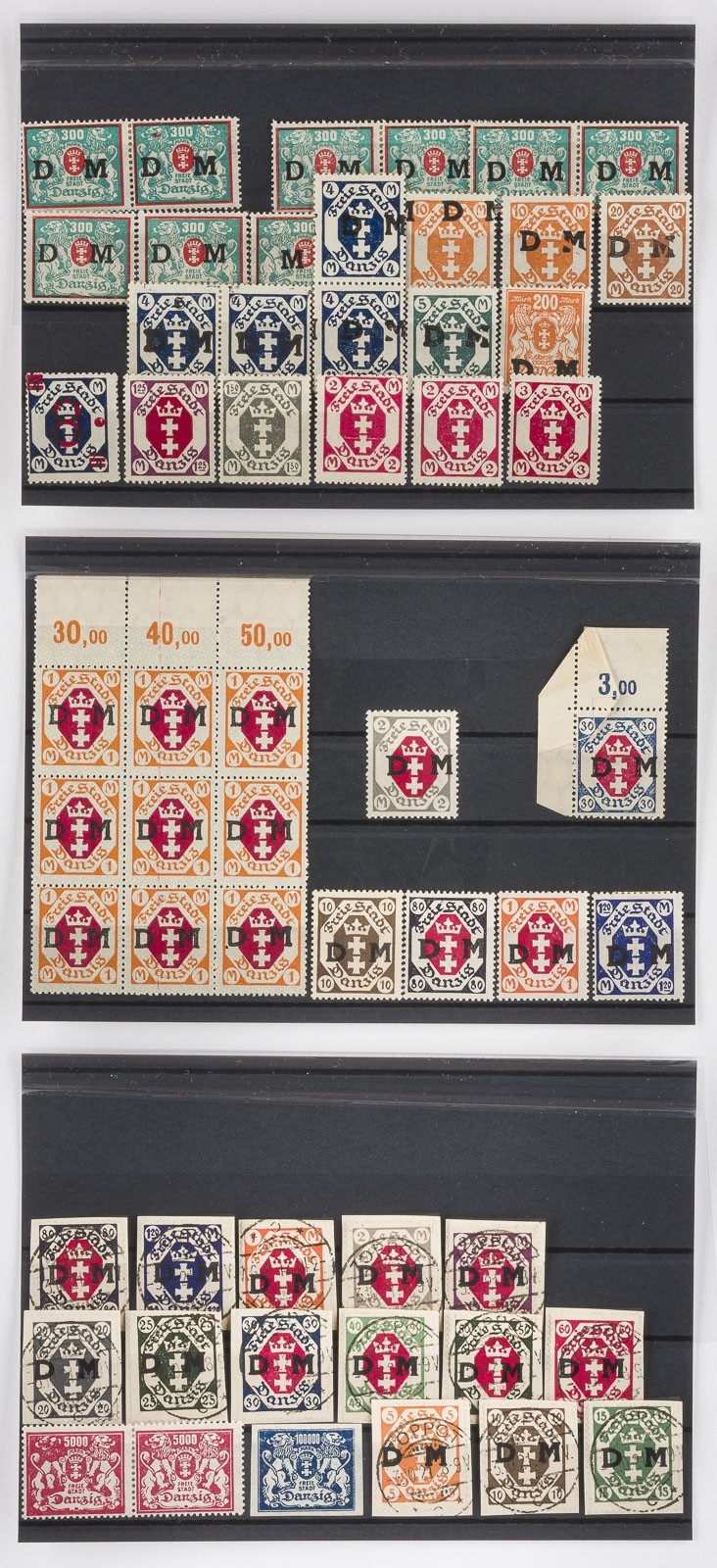 Danzig Konvout 129 diverse Dienstmarken, teilweise auf Briefausschnitt, Blöcke, teilweise