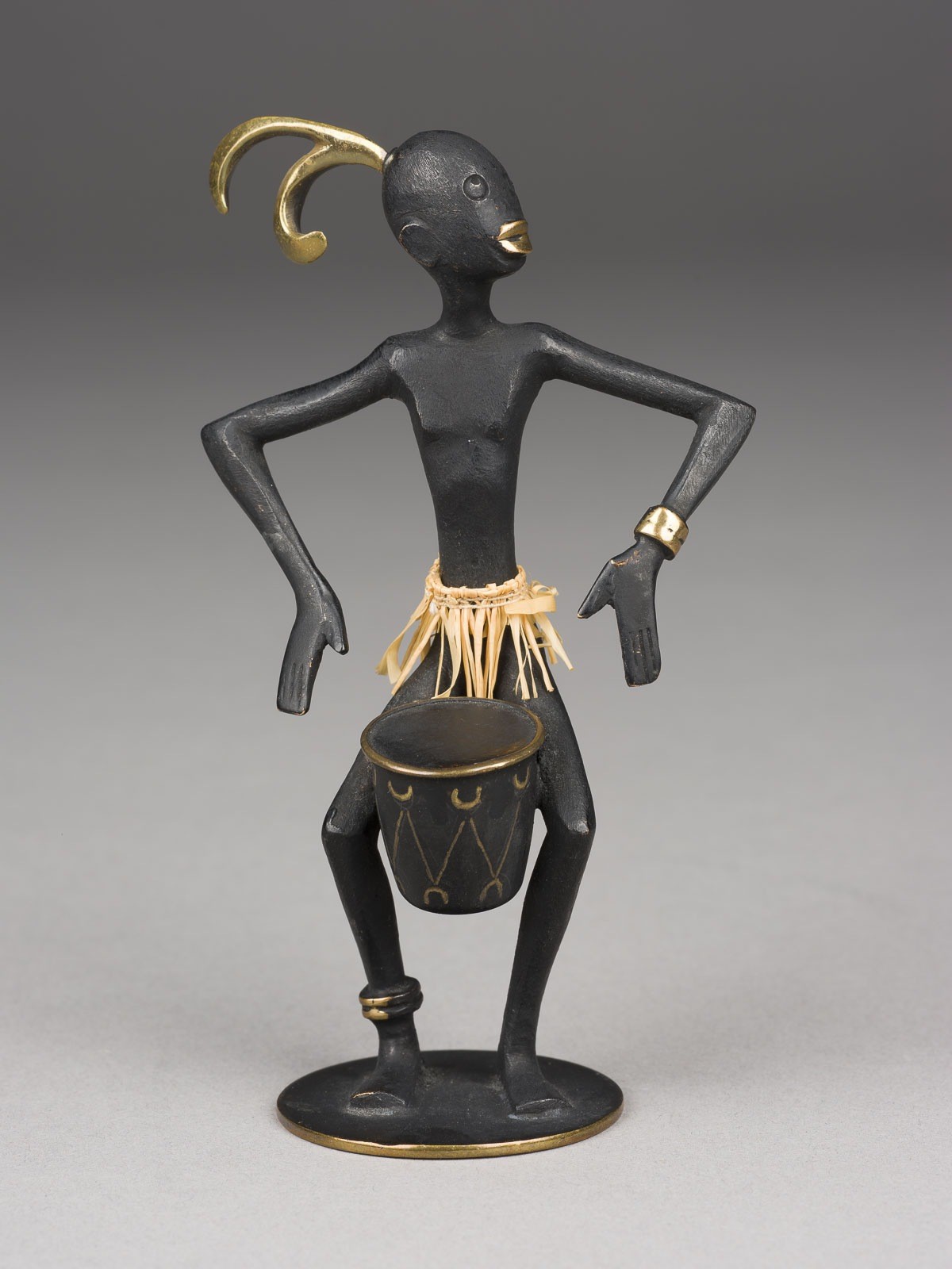 KARL WEILER Active in Pforzheim from around 1930 to 1960 AFRICAN WITH DRUM Bronze, black patina, gold-plated brass. H. 11, W. 7, D. 4.5 cm, weight approx. 110g. Marked 'Karl Weiler Pforzheim Hand Made' on the reverse. Partially rubbed and bumped.