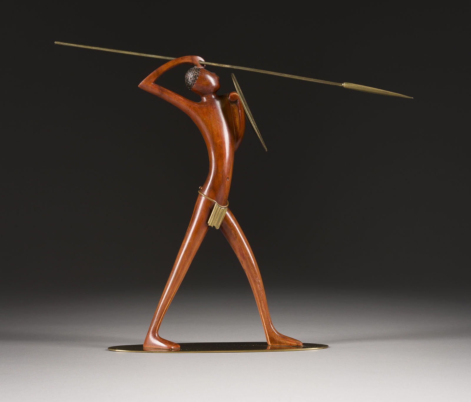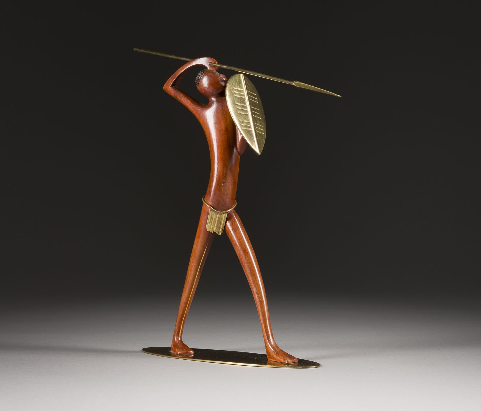 HAGENAUER WORKSHOPS (VIENNA) AFRICAN WOMAN WITH SPEAR AND SHIELD Dark brown precious wood, carved and polished, spear, shield, loincloth, and plinth made of polished brass. H. 29, W. 33, D. 8 cm. Marked 'wHw' and 'Hagenauer Wien' on the reverse. Minimal bumped and rubbed.