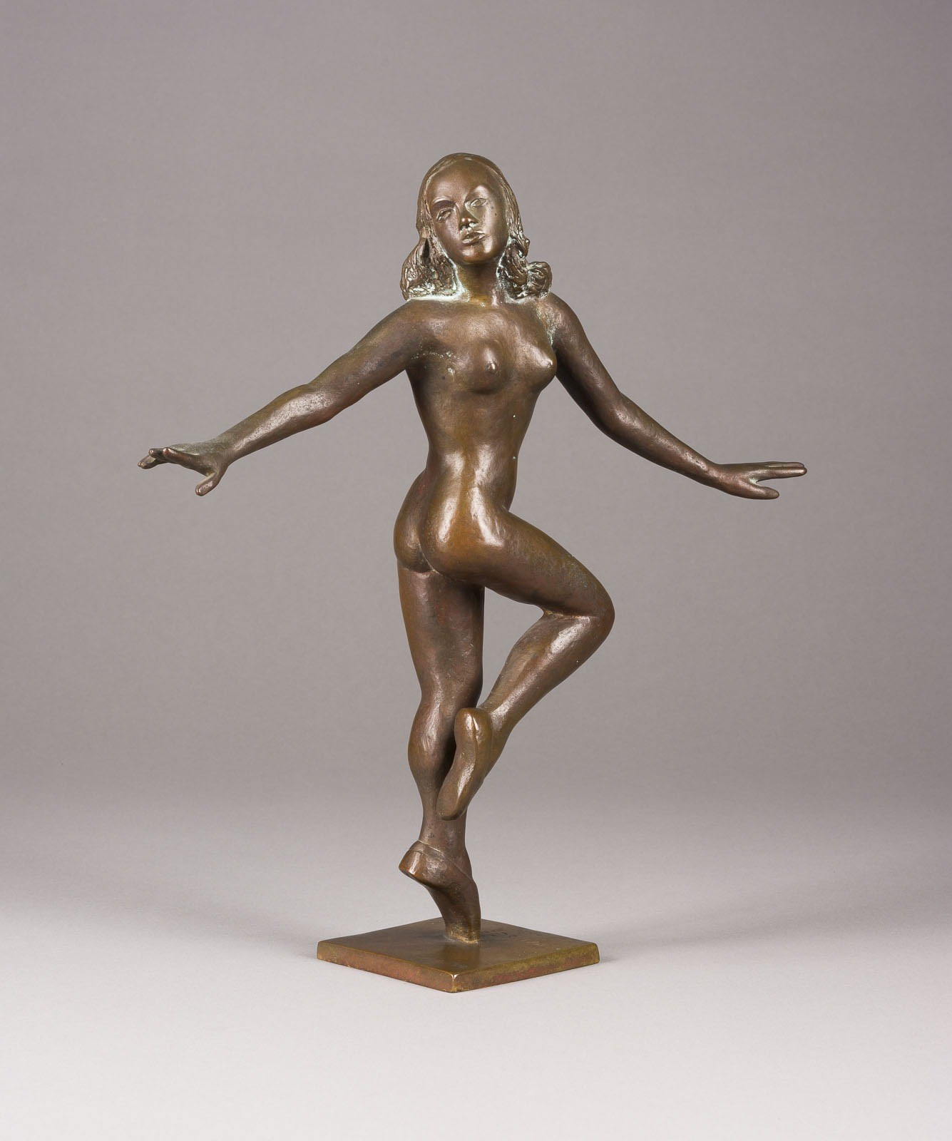 HANS GERWING 1893 Gelsenkirchen - 1974 Düsseldorf NUDE DANCER Bronze, dark patina, on a square plinth. H. 32.5 cm, W. 21.5 cm, D. 8 cm, Weight approx. 2.44 kg. Signed 'Hans Gerwing' on the plinth. Partial loss of patina.