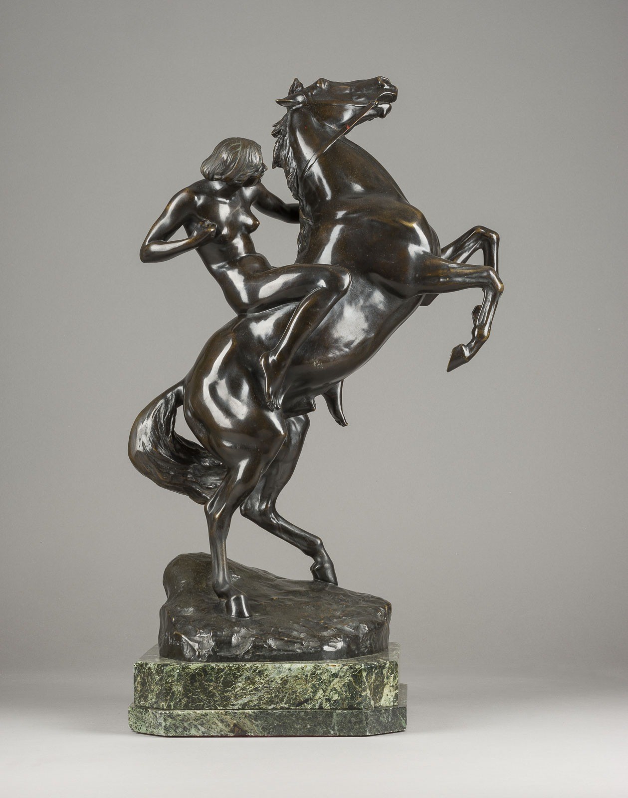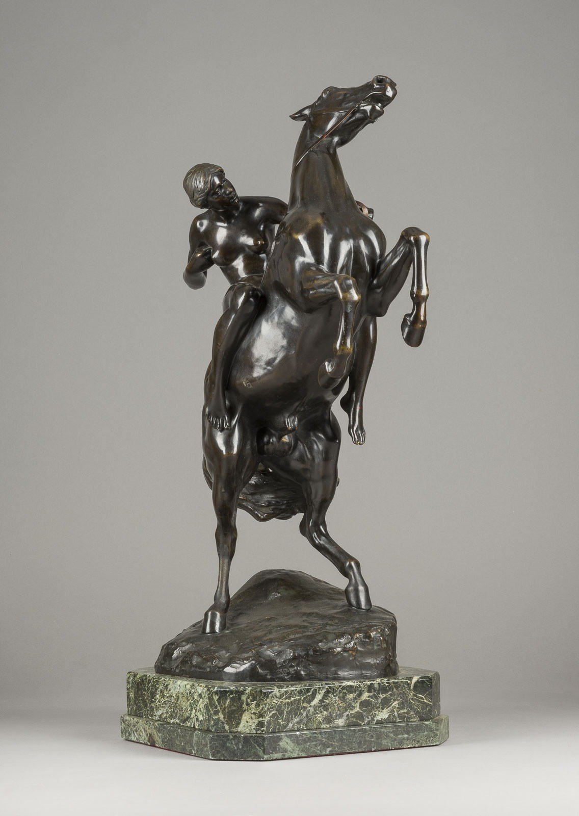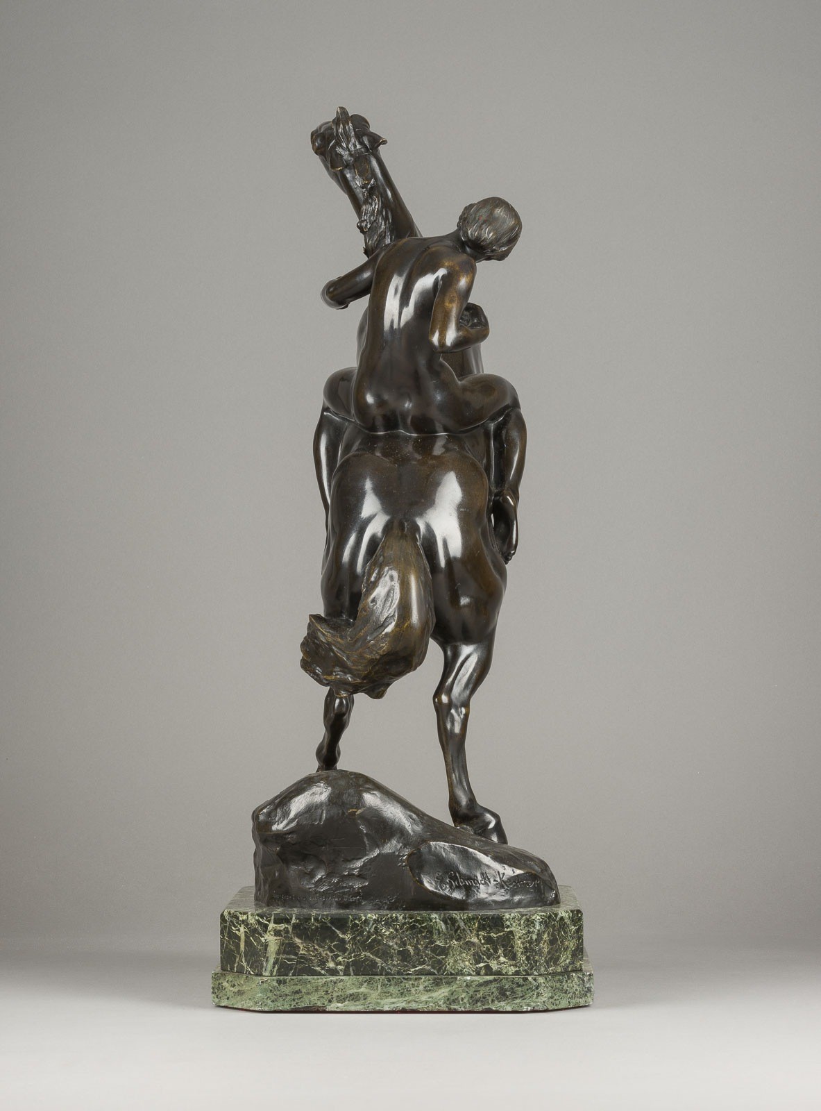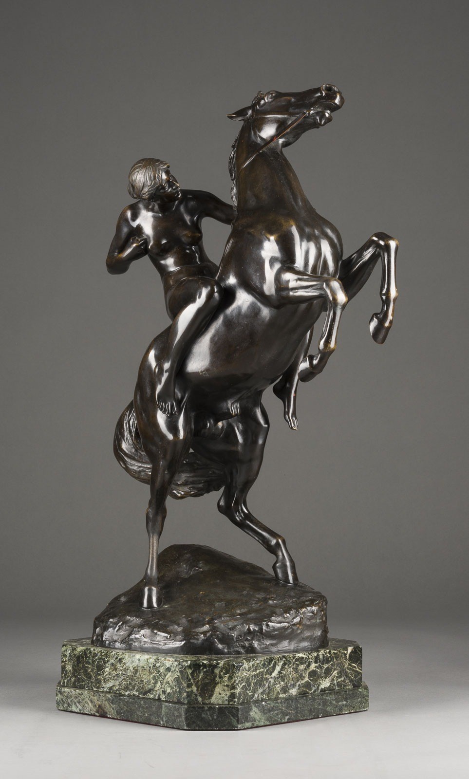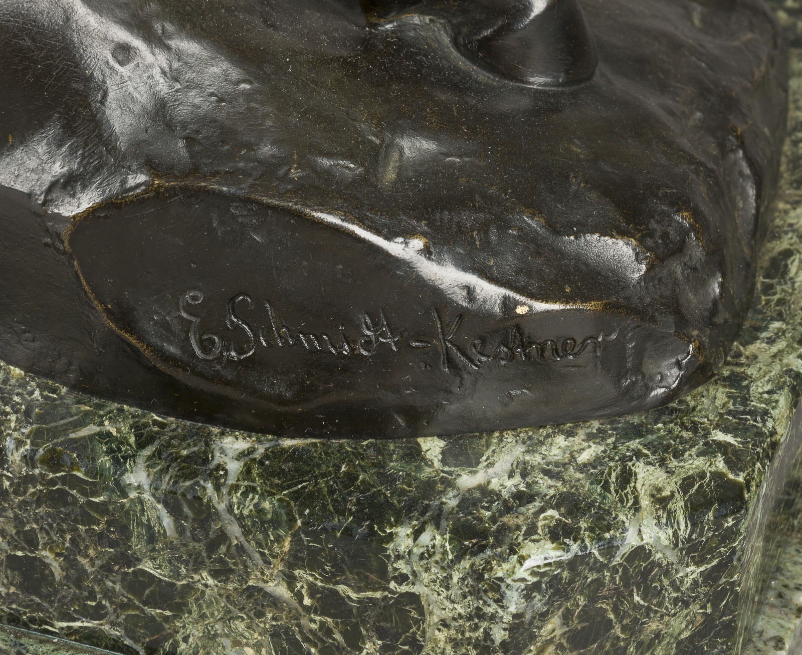 ERICH SCHMIDT-KESTNER 1877 Berlin - 1941 Nordhausen AMAZON ON A HORSE Bronze, dark brown patina, on a naturalistic plinth and marble base (h. 7 cm). H. 61, w. 40, d. 26 cm, weight approx. 24.57 kg. Inscribed on the plinth 'E. Schmidt-Kestner', with foundry mark 'Akt-Ges. Gladenbeck Berlin'. On a rock base a fully sculpted depiction of a rising horse with an Amazon sitting on it, holding a spear in her right hand. Min. loss of patina and bumped.