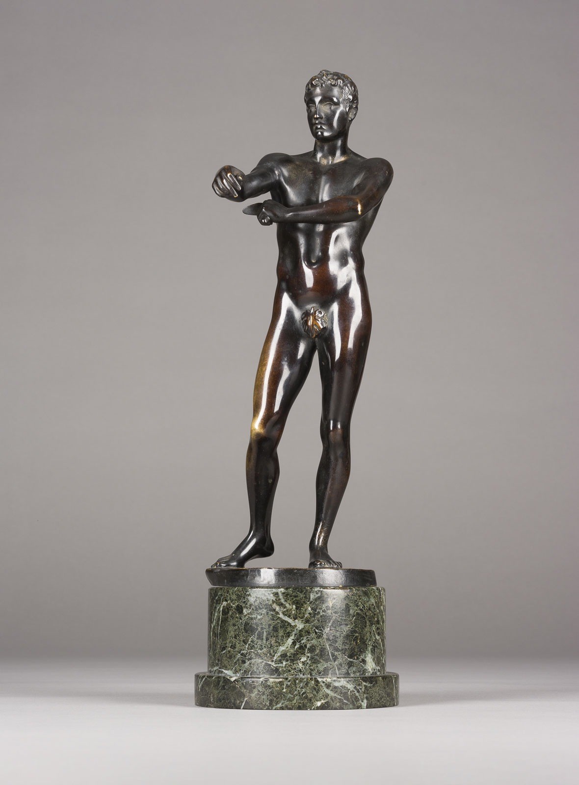 HANS MÜLLER 1873 Vienna - 1937 ibid APOXYOMENOS (STANDING MALE NUDITY) Bronze, dark patina, on round plinth and marble base (H. 8 cm). Total H. 42, W. 13, D 16 cm, weight approx. Marked 'Red. H. Müller' on the plinth. Athletic depiction of a male nude based on the ancient motif of Apoxyomenos, who is scraping dust and sweat from his skin with a strigil after a competition. Partial loss of patina and bumped.