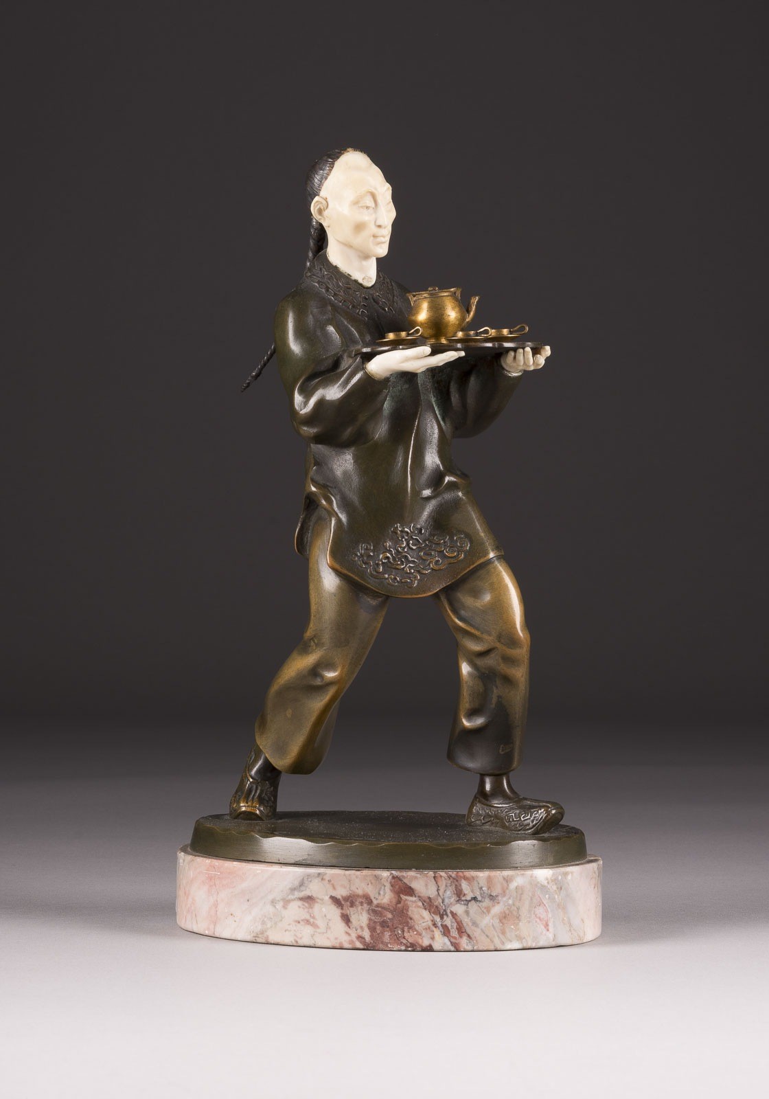 OTTO HOFFMANN 1885 Berlin - 1915 'CHINESE MAN WITH TRAY'* Chryselephantine, bronze, dark patina, face and hands carved from ivory, on oval plinth and marble base (H. 3 cm). Total H. 30.5, W. 16, D. 12.5 cm, weight approx. 3.55 kg. Signed 'O. Hoffmann' on the plinth. Elegant depiction of a standing Chinese man in traditional dress with a braided pigtail, presenting a tray with a tea service. Partially damaged, loss of patina, rest. Provenance: Private collection, Hesse. CITES marketing certificate is available. Please note that due to the current CITES regulations for ivory and tortoiseshell objects, unrestricted trade is only permitted within the European Community. An export license is required for shipment to third countries. Please inform yourself about the current import regulations for ivory and tortoiseshell in your country. It is currently not possible to export ivory to the USA, Canada or England. This item is not legal to sell in the UK.