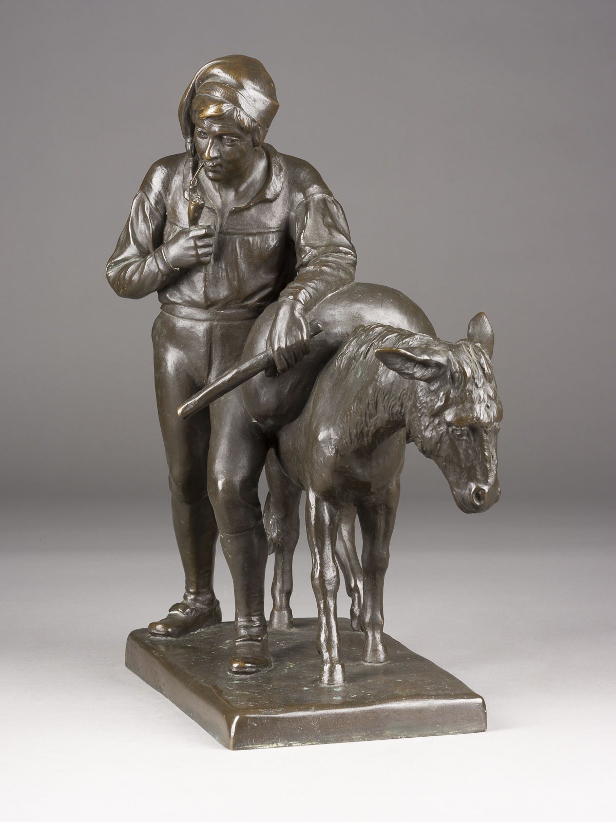 UNKNOWN SCULPTOR Active in the early 20th century THE DONKEY DRIVER Bronze, dark patina, on rectangular plinth (H. 3 cm). Total height 37.5, width 31, depth 15 cm, weight approx. 10.28 kg. Unsigned. Genre-like depiction of a pipe-smoking wanderer, holding a stick in one hand, leaning on the pack-bearing donkey beside him. Partial loss of patina and rubbing.
