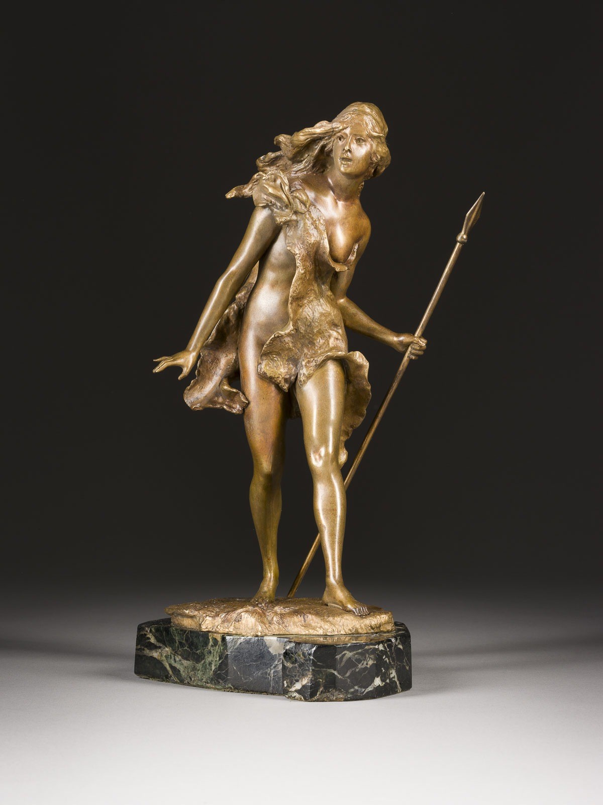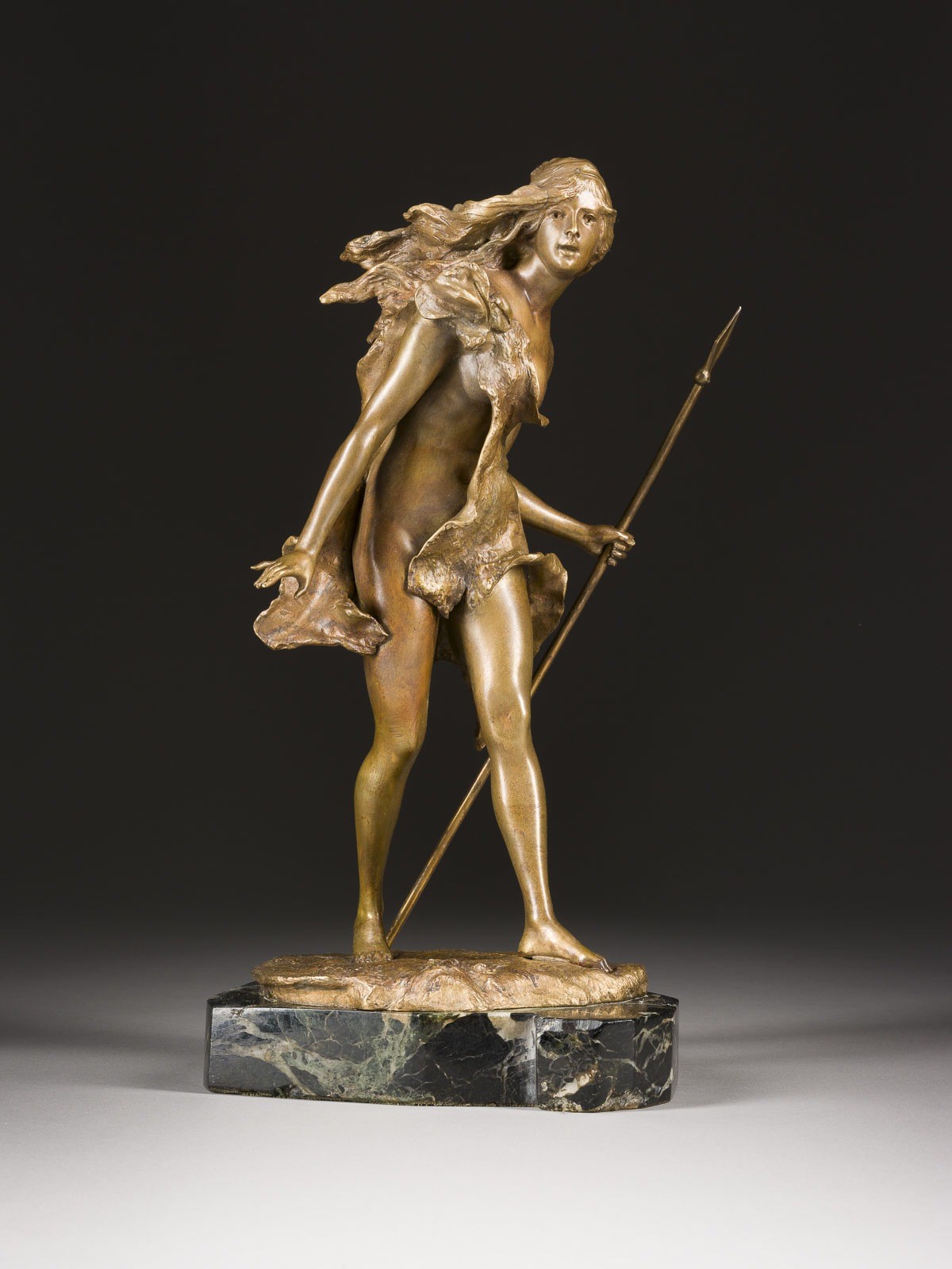PAUL LUDWIG KOWALCZEWSKI 1865 Mieltschin - 1910 Berlin DIANA WITH A HUNTING DOG Bronze, gilt patina, on a naturalistic plinth and marble base (H. 3 cm). Total height 33, width 20, D 14 cm, weight approx. 4.1 kg. Marked 'P. Kowalczewski Berlin' on the plinth. Fully sculpted representation of Diana, goddess of the hunt, striding forward with a lance, dressed in animal skins. Minor damage, hunting dog missing.