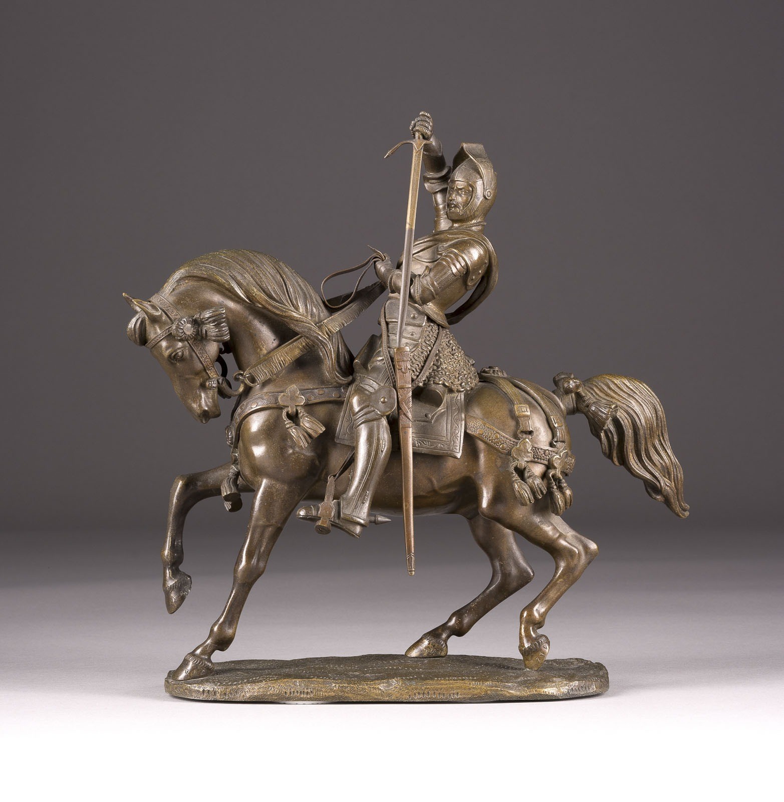 CARLO MAROCHETTI 1805 Turin - 1867 Paris (probably) 'EMANUEL PHILIBERT, DUKE OF SAVOYEN' Bronze, dark patina, on an oval plinth. H. 27.5 cm, W. 25.5 cm, D. 11 cm, Weight approx. 3.66 kg. Unsigned, probably Marochetti. A representative depiction of Emanuel Philibert, Duke of Savoy, as a victorious general in historical armor. The Duke is shown mounted on horseback, drawing his sword in a powerful gesture. Minimal loss of patina.