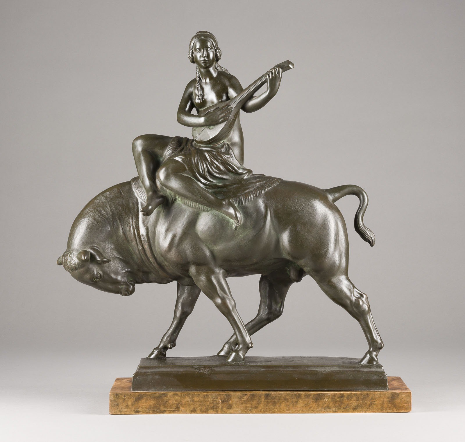 PAUL ESCHERT Active in the early 20th century 'EUROPE WITH LUTE ON THE BULL' Bronze, dark patina, on rectangular plinth and base (H. 3 cm). Total height approx. 51, width 43, D. 16 cm, weight approx. 13.8 kg. Signed 'P. Eschert' on the plinth, sculptor during National Socialism. Mythological bronze figure group depicting Europa on the bull, but in an unusual iconographic variation with a lute as an attribute. The seated female figure appears calm and elegant, while the bull is rendered powerfully and with an emphasis on movement. Paul Eschert was a German sculptor of the early 20th century whose artistic work during the National Socialist era was characterized by a naturalistic formal language. Through his participation in the 'Great German Art Exhibitions' and the creation of portrait busts of leading representatives of the regime, he was significantly involved in the state's self-representation during this era. Min. bumped, patina refreshed.