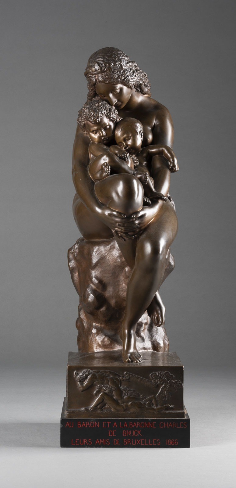 Bronze, braun patiniert, auf rechteckiger Plinthe und Marmorsockel (H. 13 cm). Ges.-H. 62, B. 21, T. 27 cm, Gew. ca. 22 kg. Seitlich Sig. 'A te Debay', dat. '1845', Verso Gießereimarke 'F. Barbedienne Fondeur'. Über einem rechteckigen Stand korrespondierender Sockel mit der vollplastischen