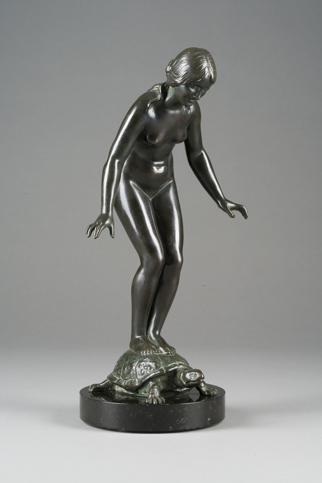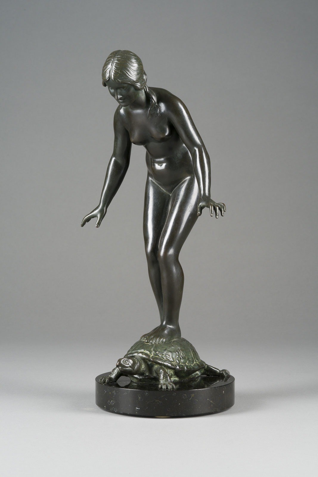 RICHARD FABRICIUS 1863 Berlin - 1923 Dresden FEMALE NUDE STANDING ON A TURTLE Electroplated cast, dark patina, on a round marble base (H. 3 cm). Total H. 37, W. 18.5, D. 15.5 cm. Inscribed 'RD. Fabricius' on the turtle. Partial loss of patina and rubbed.