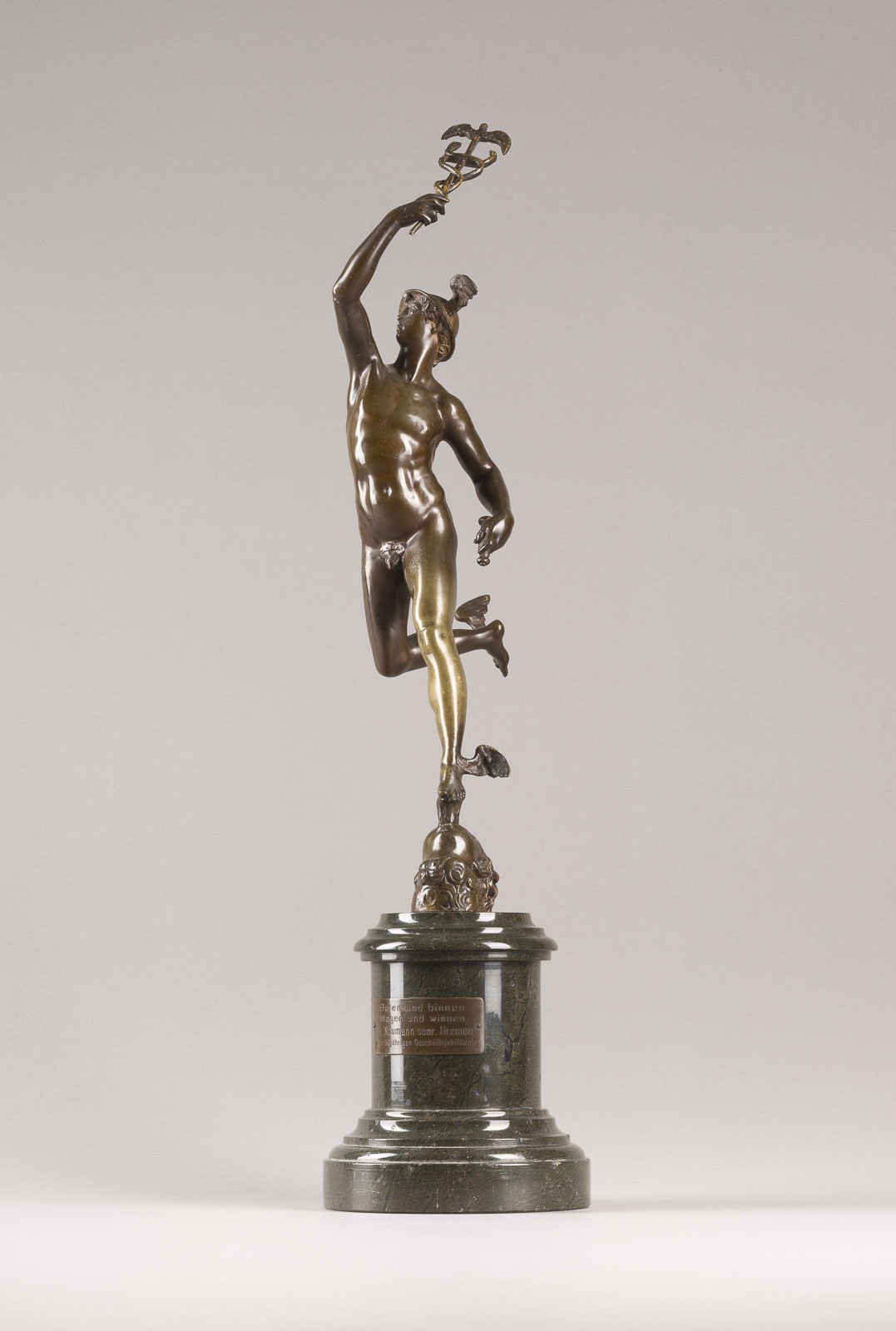 GIOVANNI BOLOGNA GEN. GIAMBOLOGNA 1529 Douai - 1608 Florence (after) HERMES / MERCURY Bronze, dark patina, on a marble column base (H. 16 cm). Total H. 57, W. 16, D. 19 cm, weight approx. 6 kg. Dedication plaque on the front: 'Buten und binnen Wagen und Winnen Fr. Naumann senr. Bremen zum 50 jährigen Geschäftsjubiläm' (Outward and inward, carts and winds, Fr. Naumann senr. Bremen on the 50th anniversary of the business). Fully sculpted representation of the messenger of the gods Hermes/Mercury in a dynamic pose, balancing on a head as an allegory of the wind. Partial loss of patina and some bumping.