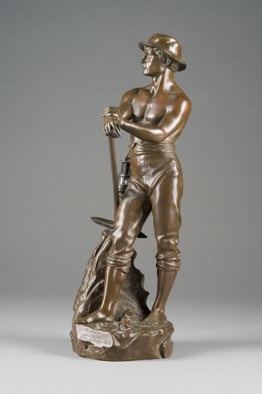 CHARLES OCTAVE LEVY 1820 Paris - 1899 ibid 'LE MINEUR' Bronze, brown patina. H. 42.5, W. 15, D. 14.5 cm, weight approx. 5.45 kg. Marked 'Mineur par Ch. Levy Salon des Beaux-Arts' on the front, signed 'Ch. Levy' on the side, with foundry mark 'Bronze Garanti au Titre L.V. Dépose' and numbered '8866' on the back. Above a naturalistic rock base, a full-length representation of a miner in a proud posture, leaning on a pickaxe. Minor loss of patina. Provenance: Private collection, North Rhine-Westphalia.