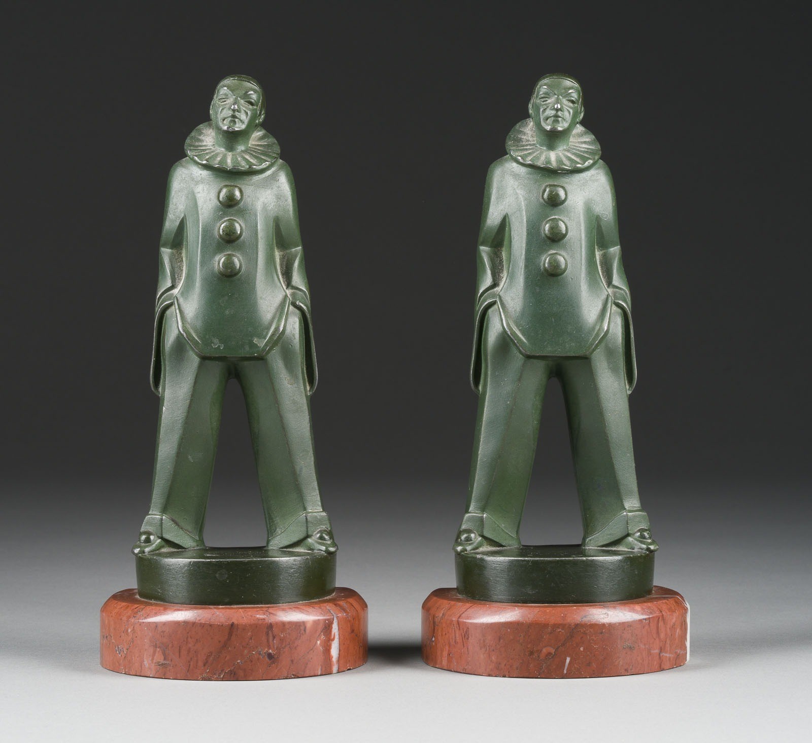 MAX LE VERRIER 1891 Neuilly-sur-Seine - 1973 Paris PAIR OF PIERROT FIGURES AS BOOKENDS Bronze, dark patina, on semicircular plinth and base (H. 2.5 cm). Total H. 19 each, W. 8.5, D. 6.5 cm, weight approx. 1 kg. Marked 'M. Le. Verrier' on the reverse. Partially bumped and rubbed.