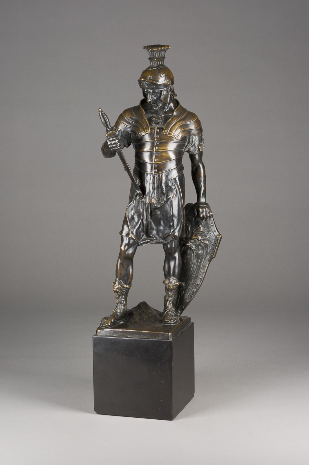 PAUL LUDWIG KOWALCZEWSKI 1865 Mieltschin - 1910 Berlin (probably) ROMAN WARRIOR Bronze, dark patina, on naturalistic plinth and marble base (H. 16 cm). Total H. 71, W. 20, D. 17 cm, weight approx. 21.99 kg. On the back of the plinth, foundry mark 'Martin Piltzing Berlin', presumably Paul Ludwig Kowalczewski. Powerful depiction of a Roman warrior in a calm posture. The warrior holds a sword, which he examines closely, while leaning on a shield bearing a lion crest. The combination of military strength and thoughtful calm lends the figure an exciting expressiveness. Partial loss of patina.