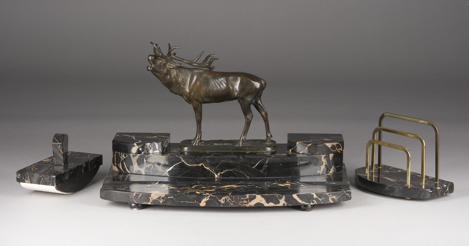 JOSEF FRANZ PALLENBERG 1882 Cologne - 1946 Düsseldorf DESK SET WITH A ROARING DEER Electroplated cast, dark patina, black marble. H. 28, W. 45, D. 23 cm. Marked 'Jos. Pallenberg' on the plinth. Three-piece desk set: tray with two inkwell holders, letter stand, and ink roller. Partial loss of patina and bumped.