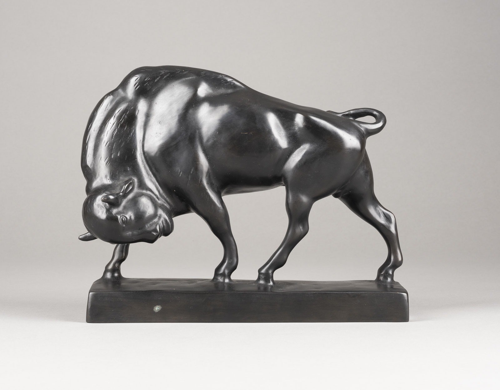 UNKNOWN SCULPTOR Active in the 20th century WALKING BISON Bronze, dark patina, on rectangular plinth (H. 3 cm). Total H. 25, W. 30, D. 11 cm Weight approx. 3.88 kg. In the style of Franz Iffland. Minimal loss of patina and some damage.