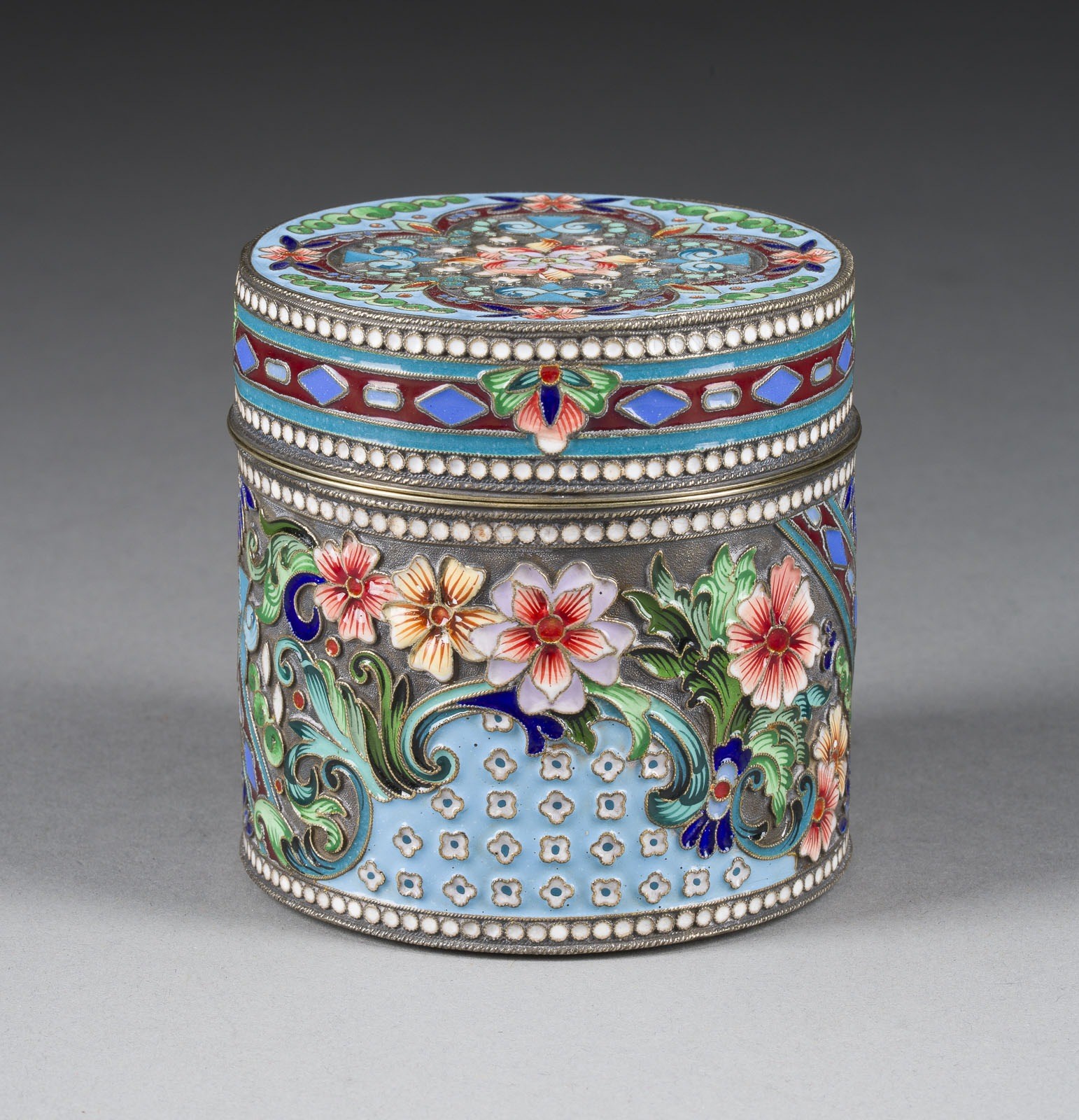 A SILVER-GILT AND CLOISONNÉ ENAMEL BOX 2nd half of the 20th century Of circular form. Bearing spurious Russian hallmarks and master's mark 'FABERGE' in Cyrillic. 6.9 cm high, 196 gr.