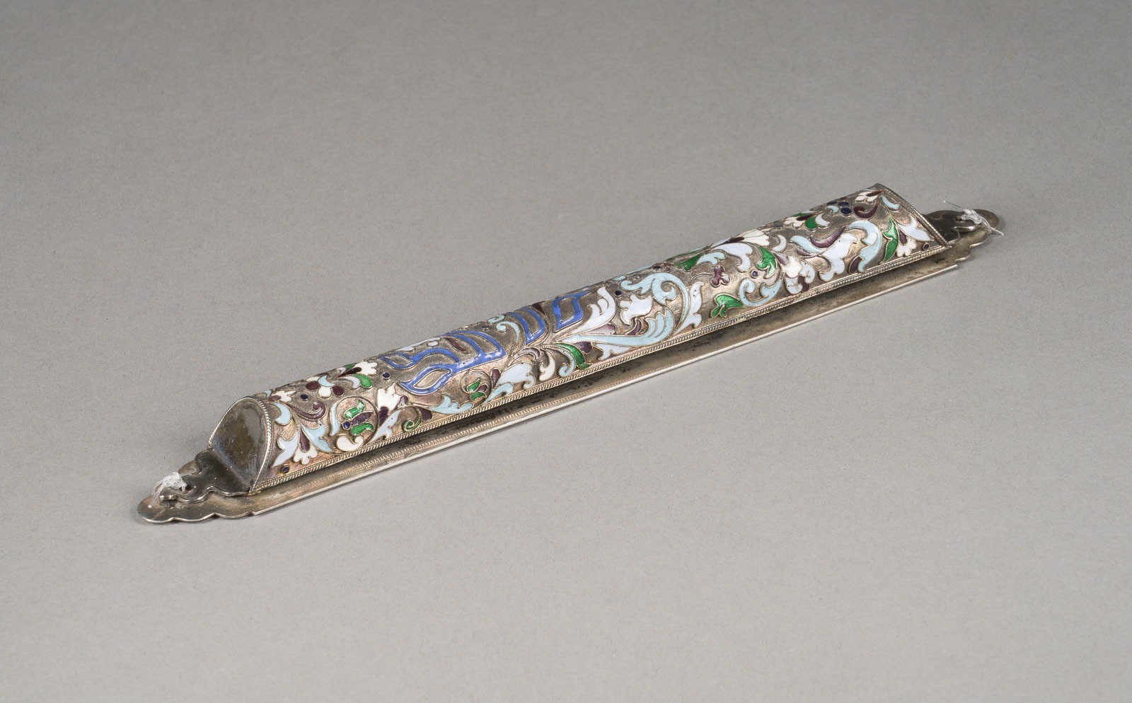A SILVER AND CLOISONNÉ ENAMEL MEZUZAH 2nd half of the 20th century Decorated with foliage. Bearing spurious Russian hallmarks. 19.9 cm long, 62 gr.