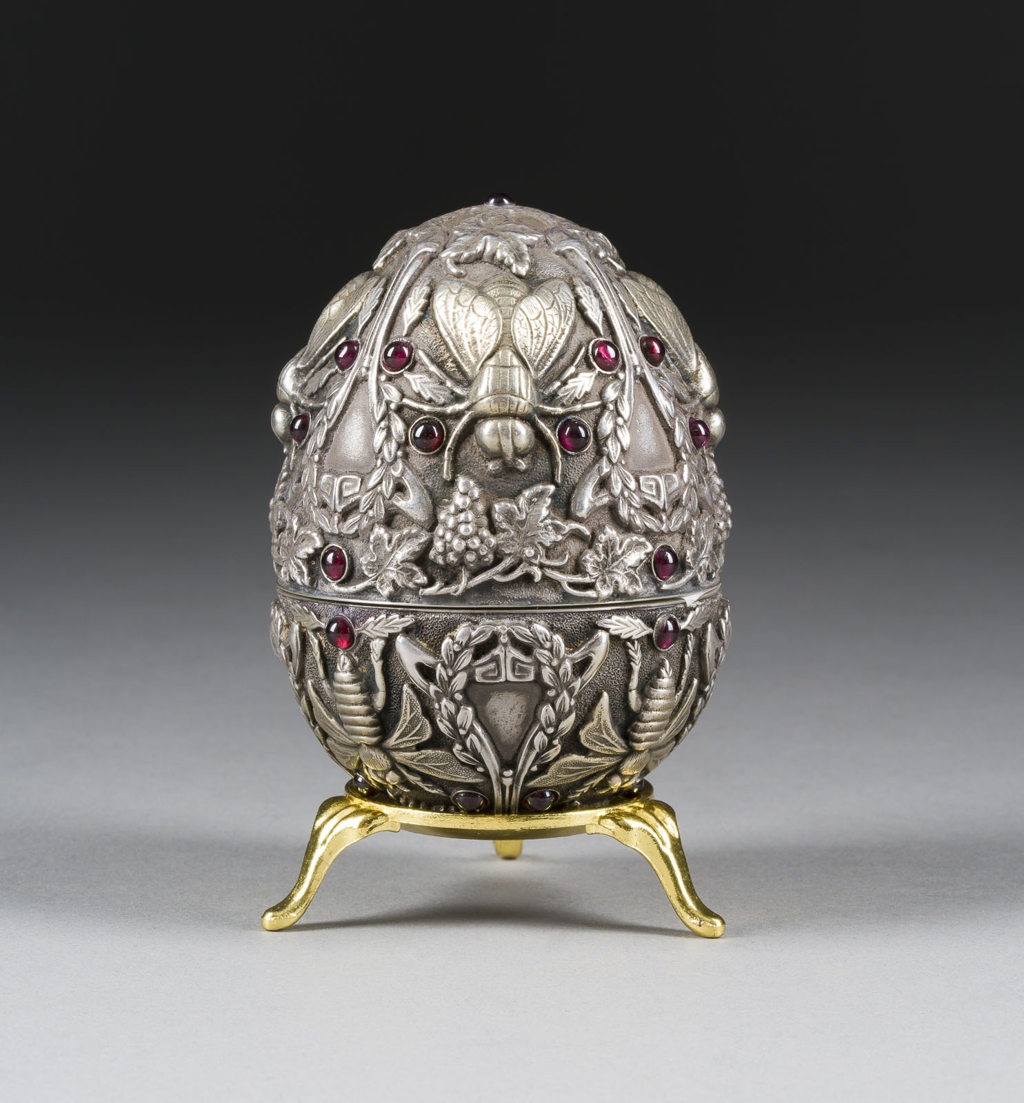 A SILVER EGG-SHAPED BOX WITH INSECT DECORATION ON STAND 2nd half of the 20th century The body embossed with flies and set with red cabochons. Bearing spurious Russian hallmarks. 9 cm high, 134 gr (without metal stand).