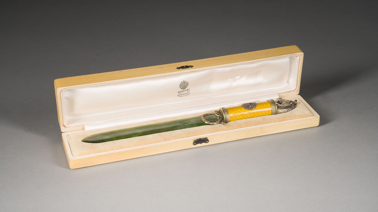 A SILVER-GILT AND GUILLOCHÉ ENAMEL AND NEPHRITE LETTER OPENER WITH CASE In the style of Fabergé, 2nd half of the 20th century Bearing spurious Russian hallmarks and master's mark 'FABERGE' in Cyrillic. 28.2 cm long.