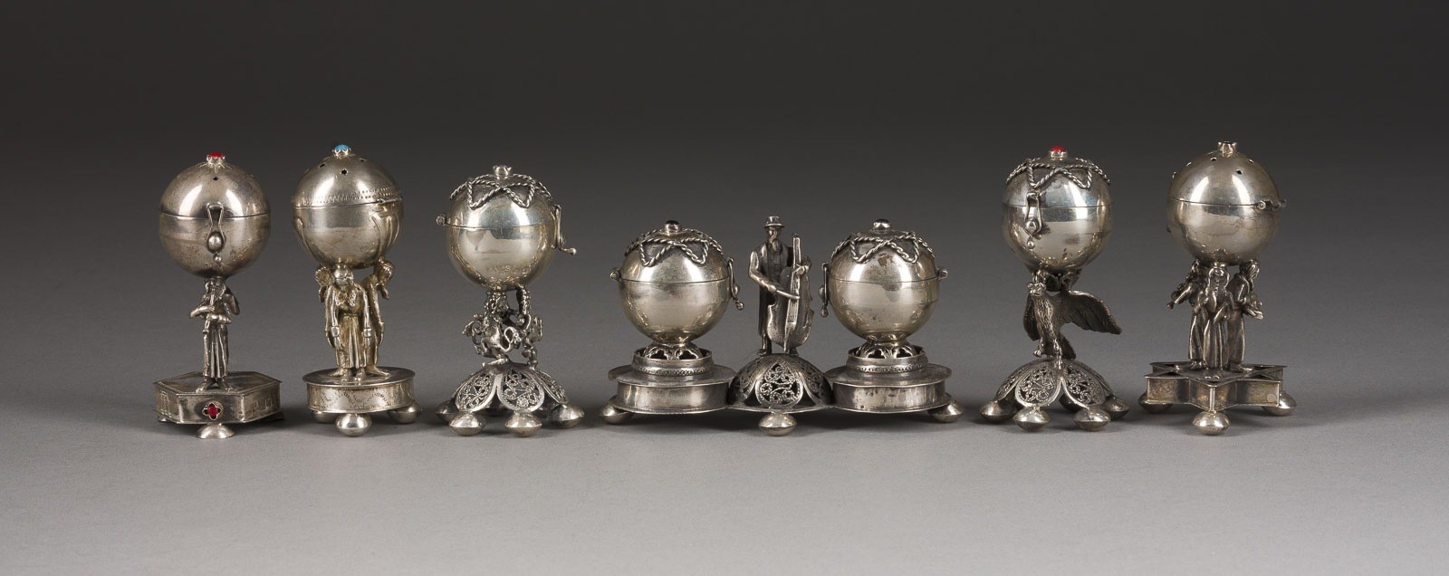 A COLLECTION OF SIX SILVER BESAMIM SPICEBOXES WITH MUSICIANS 2nd half of the 20th century Bearinf spurious Russian hallmarks. 6-8 cm high, 390 gr.