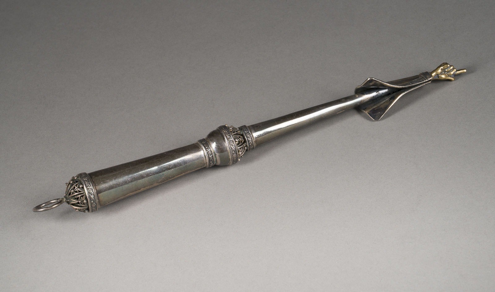A SILVER TORAH POINTER 2nd half of the 20th century Bearing spurious Russian hallmarks. 27.3 cm long, 86 gr.
