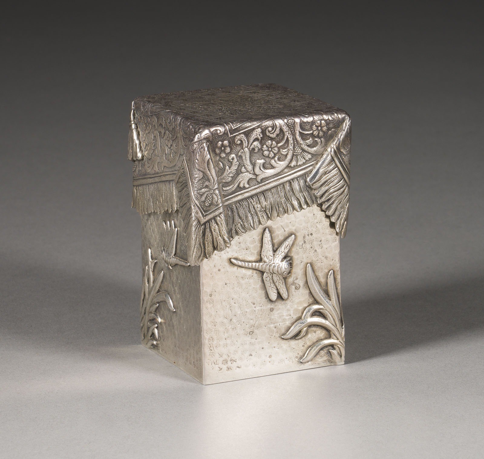 A SILVER TROMPE L'OEIL BOX 2nd half of the 20th century Bearing spurious Russian hallmarks and 'P OVCHINNIKOV' in Cyrillic. 8.2 cm high, 173 gr.