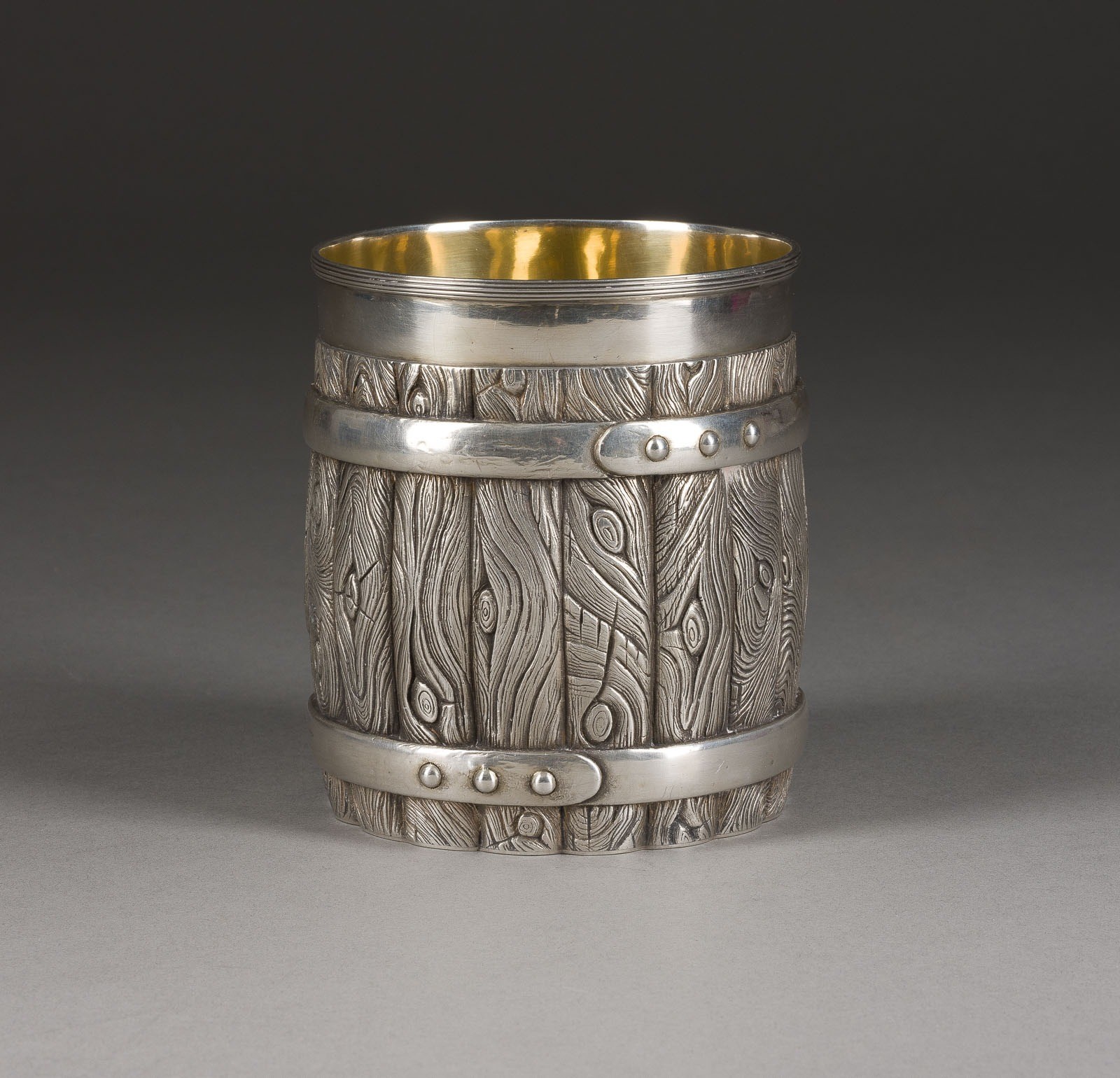 A SILVER TROMPE L'OEIL CAVIAR POT 2nd half of the 20th century Gilt interior. Bearing spurious Russian hallmarks. 10.7 cm high, 357 gr.