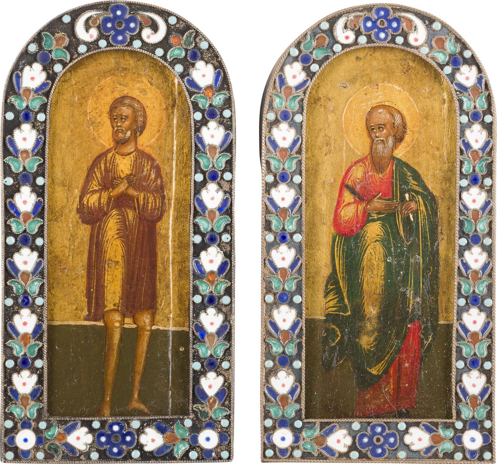 ZWEI CLOISONNÉ-EMAIL-IKONEN MIT EINEM APOSTEL UND DEM HEILIGEN ALEXIUS, MANN GOTTES