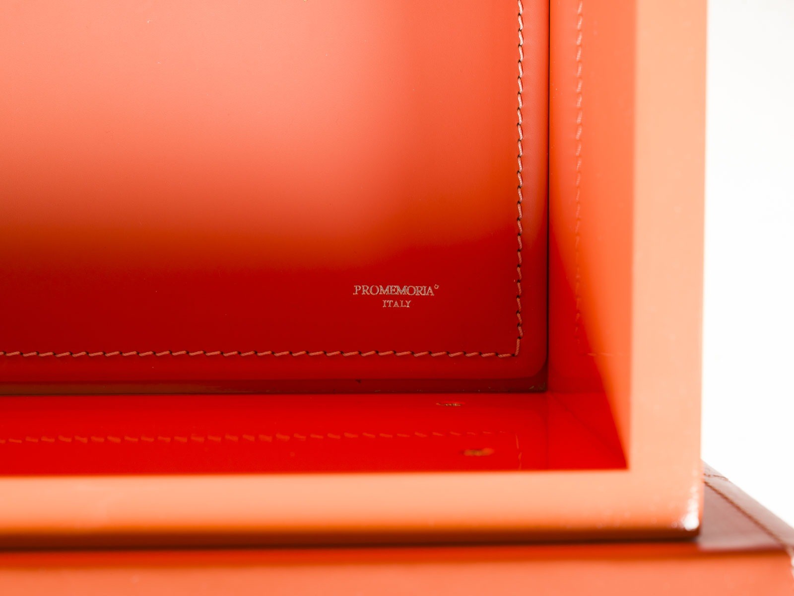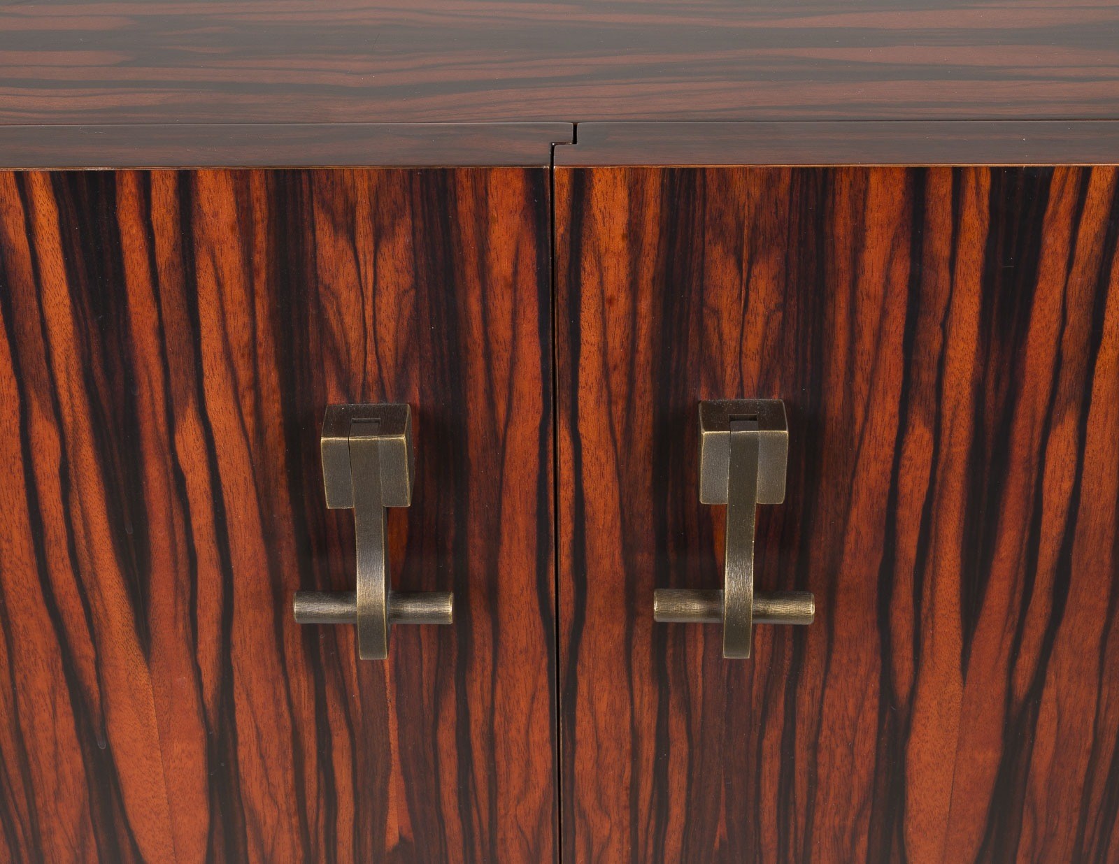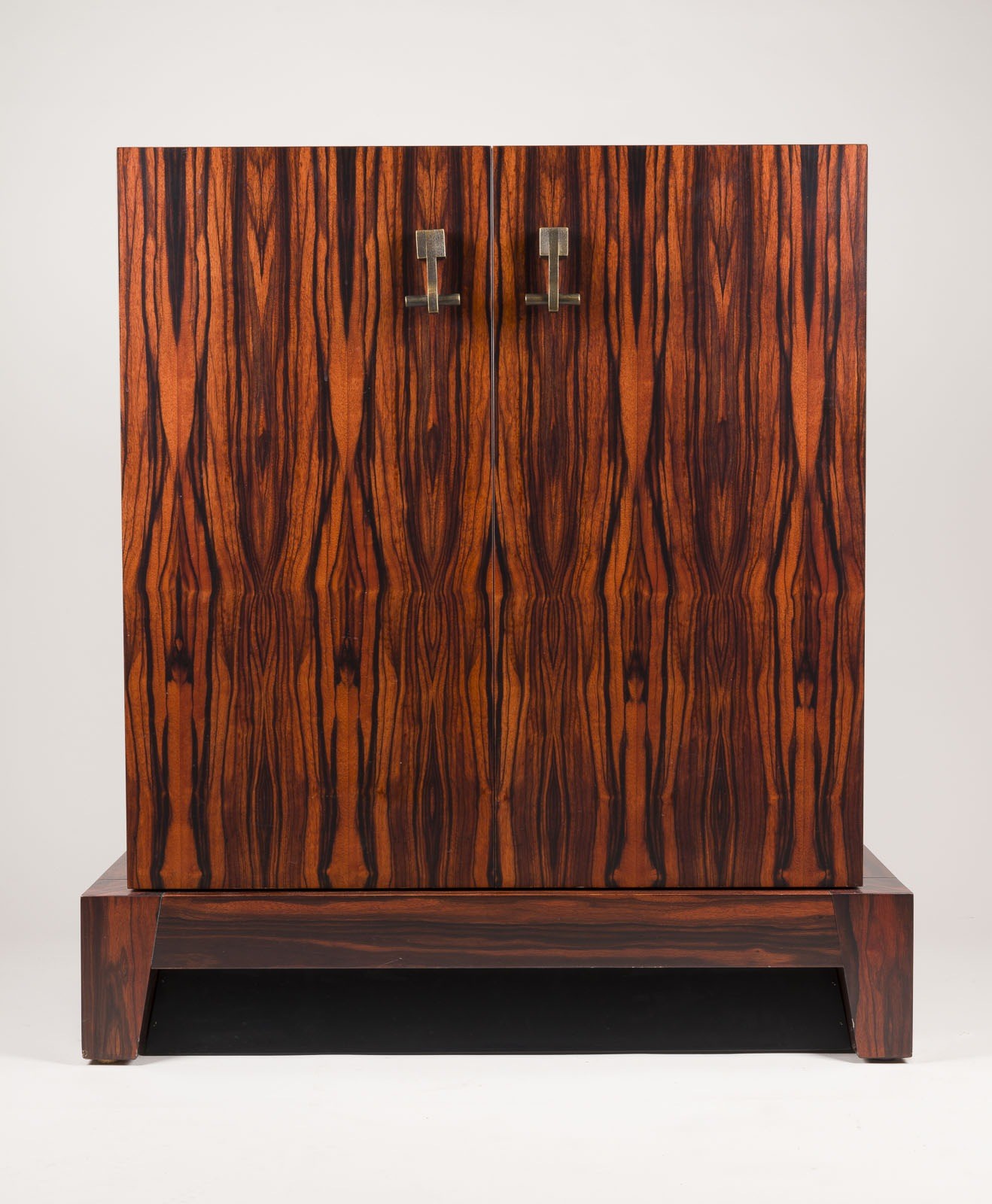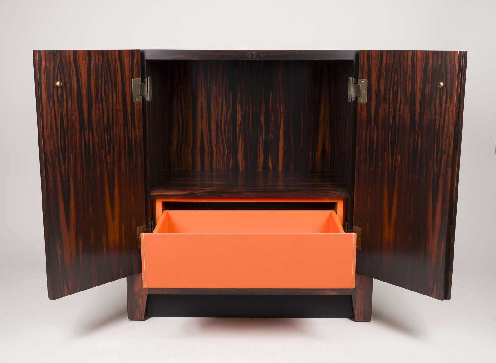 ROMEO SOZZI 1948 Valmadrera / Italy BAR CABINET 'AMARCORD' Italy, Promemoria, Design of 1998 Wood with ebony veneer, handles and fittings in cast bronze, two doors, shelf, drawer with orange leather trim. H. 98 cm, W. 90 cm, D. 48 cm. Fittings marked 'Promemoria' (in cast). Only minor traces of use. No in-house shipping available.