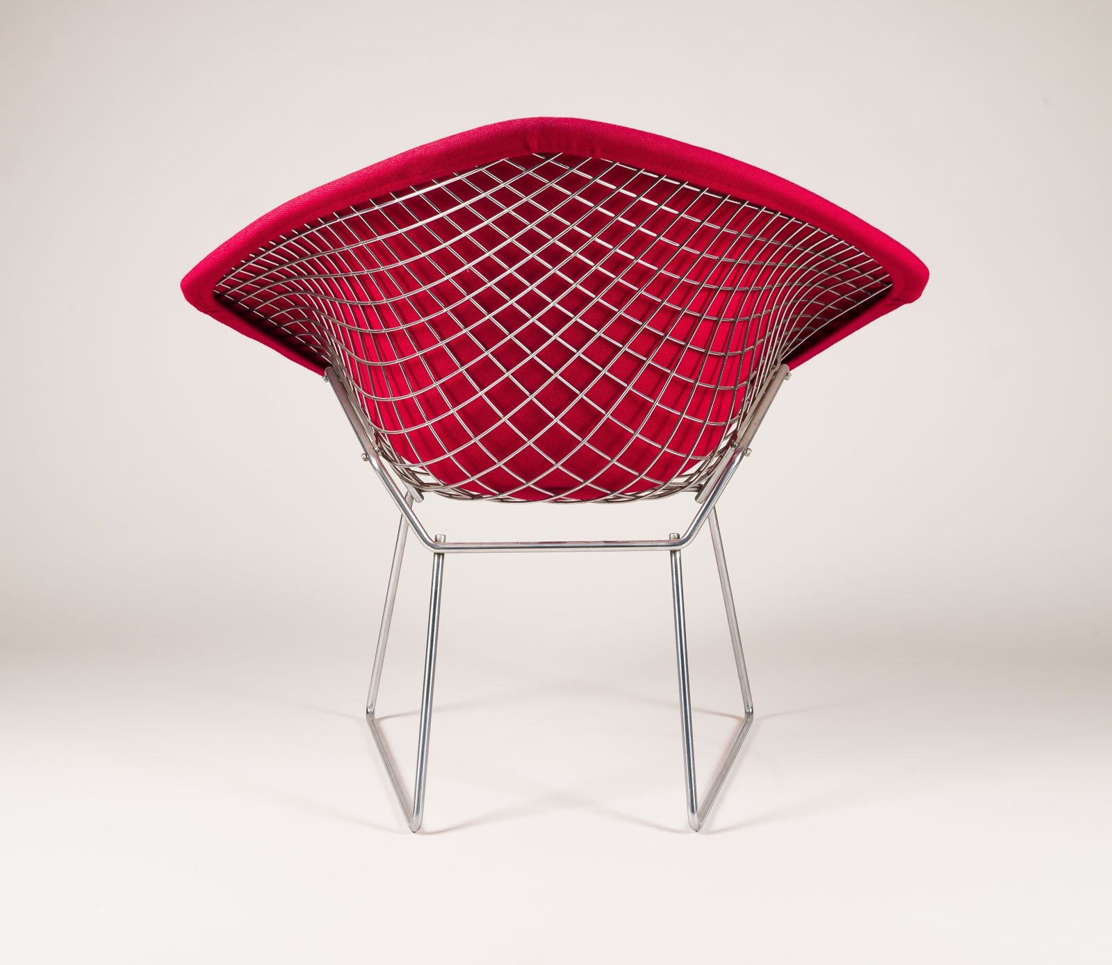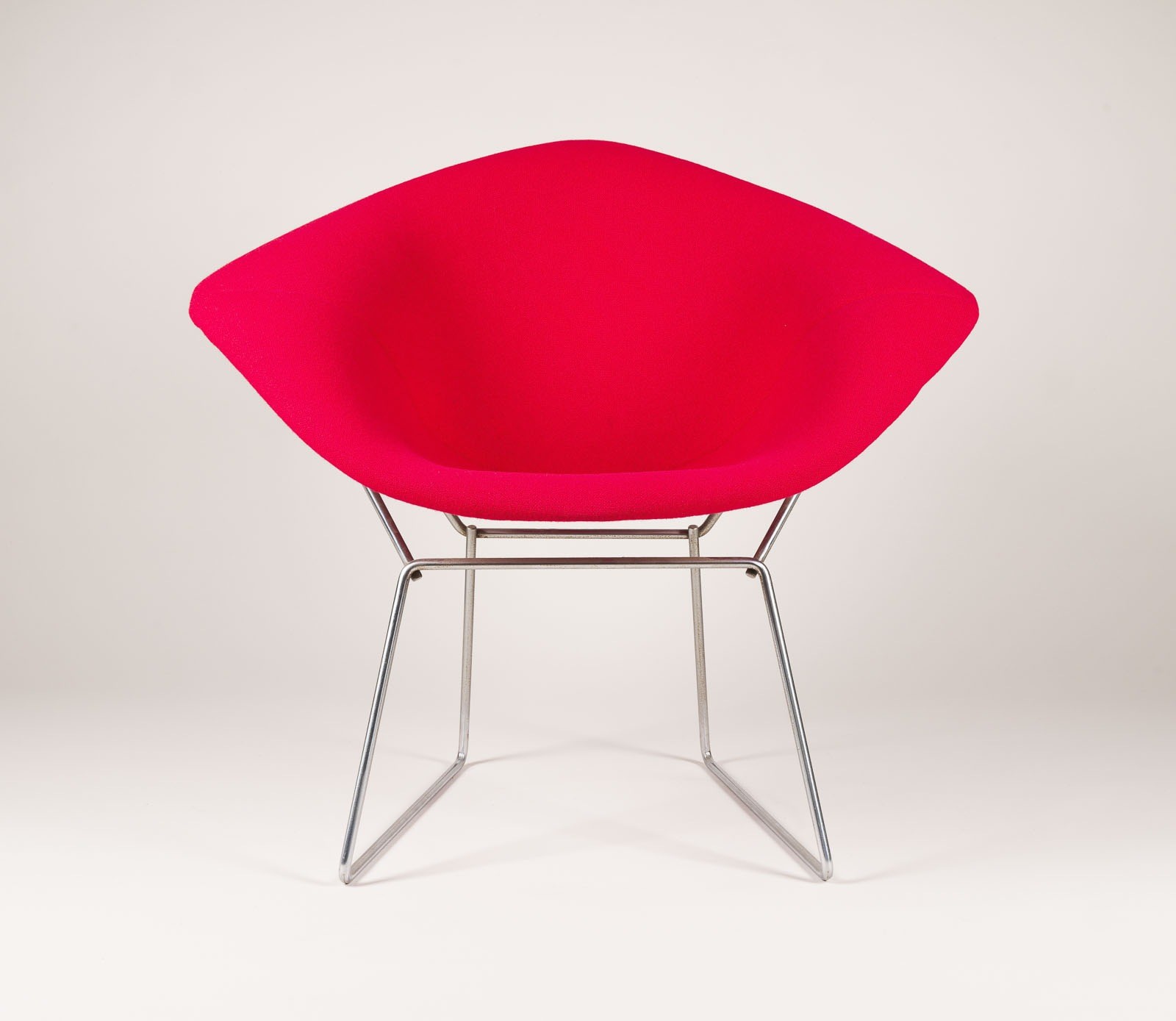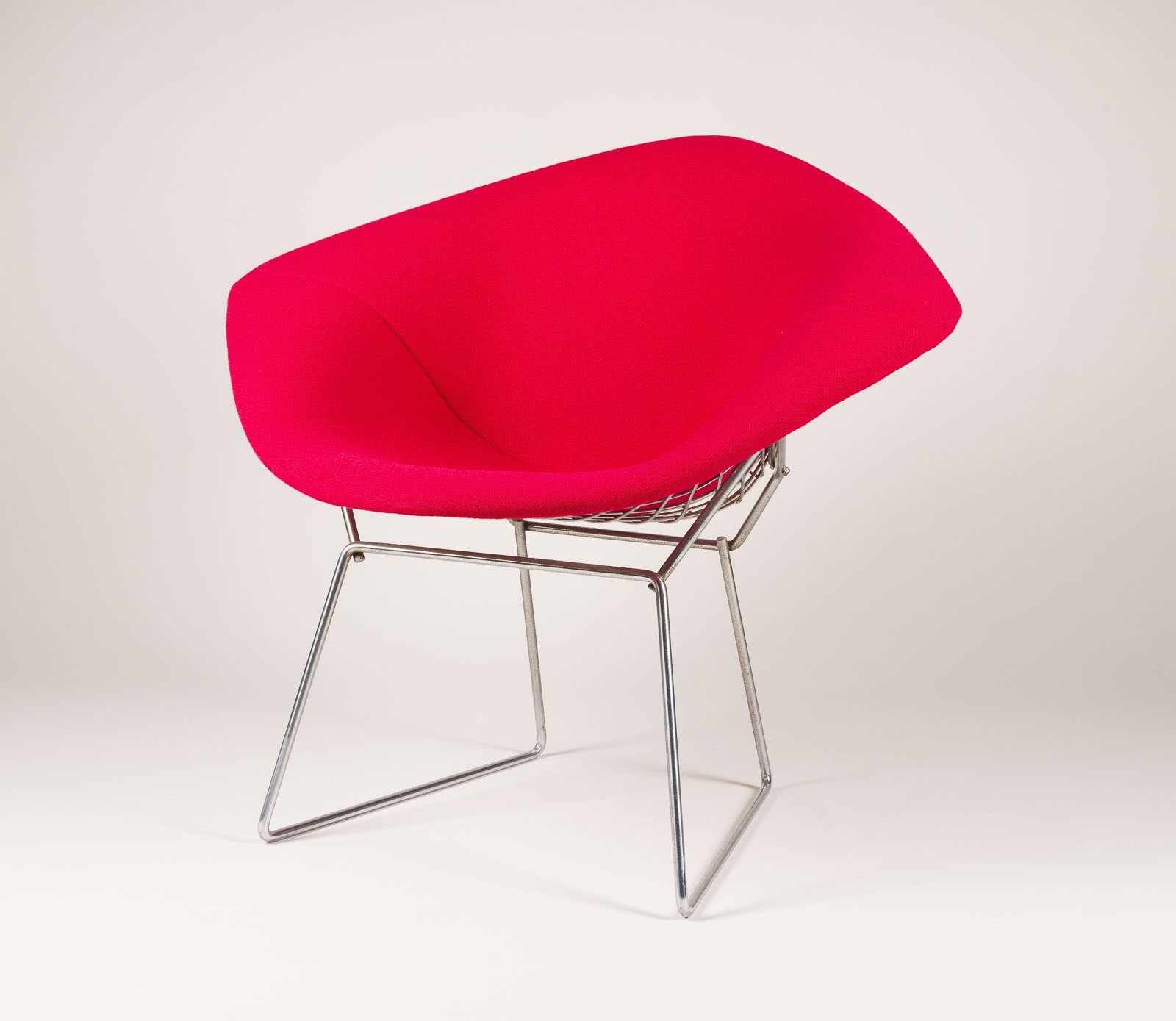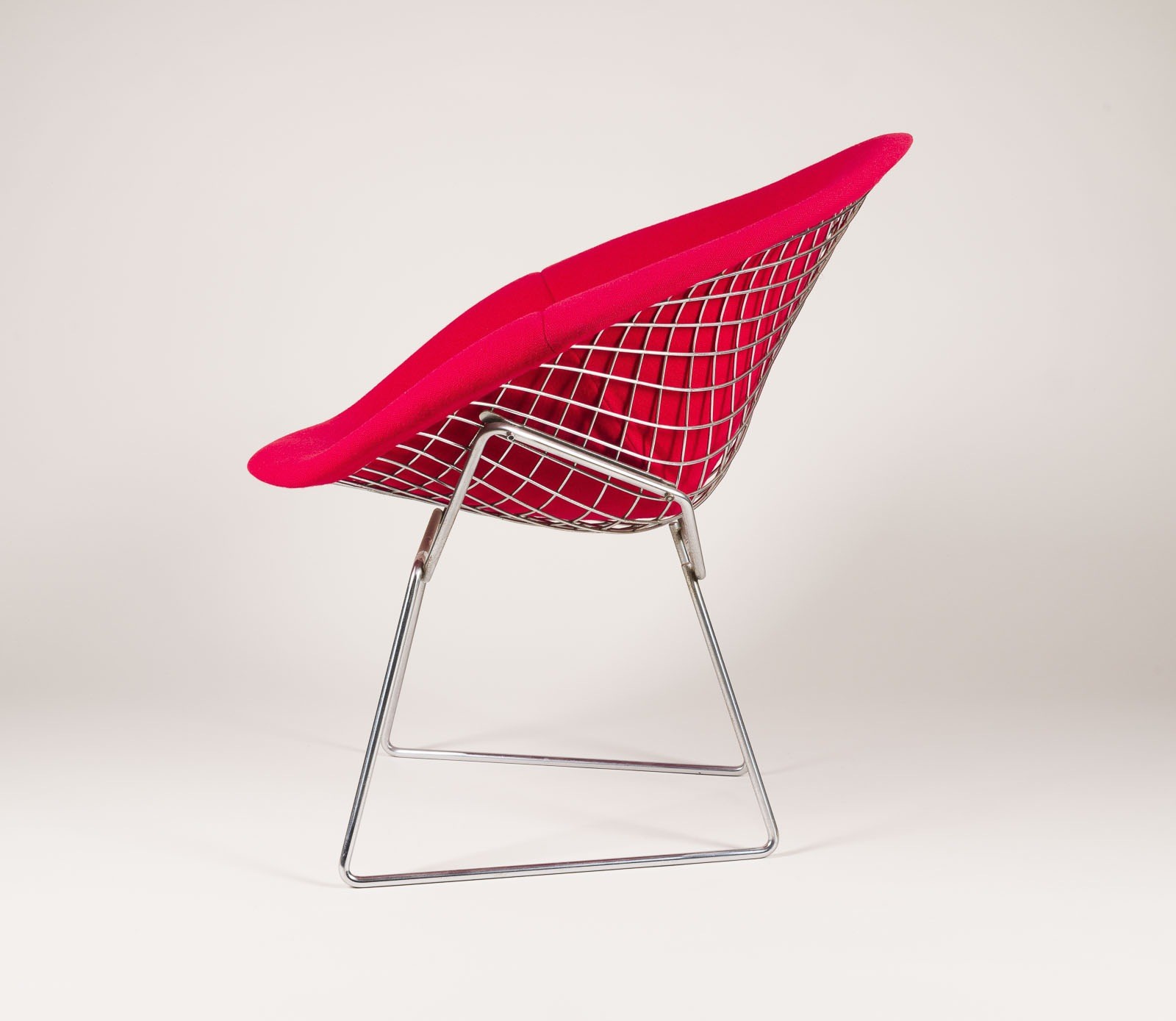 HARRY BERTOIA 1915 San Lorenzo, Italy - 1978 Barto, Pennsylvania, USA ARMCHAIR 'DIAMOND CHAIR' '421' USA / Germany, Knoll International, Design of 1952 Chrome-plated wire steel, seat cushion shell, red fabric cover. H. 75 cm, W. 85 cm, D. 73 cm. Minor traces of age related wear. No in-house shipping available.