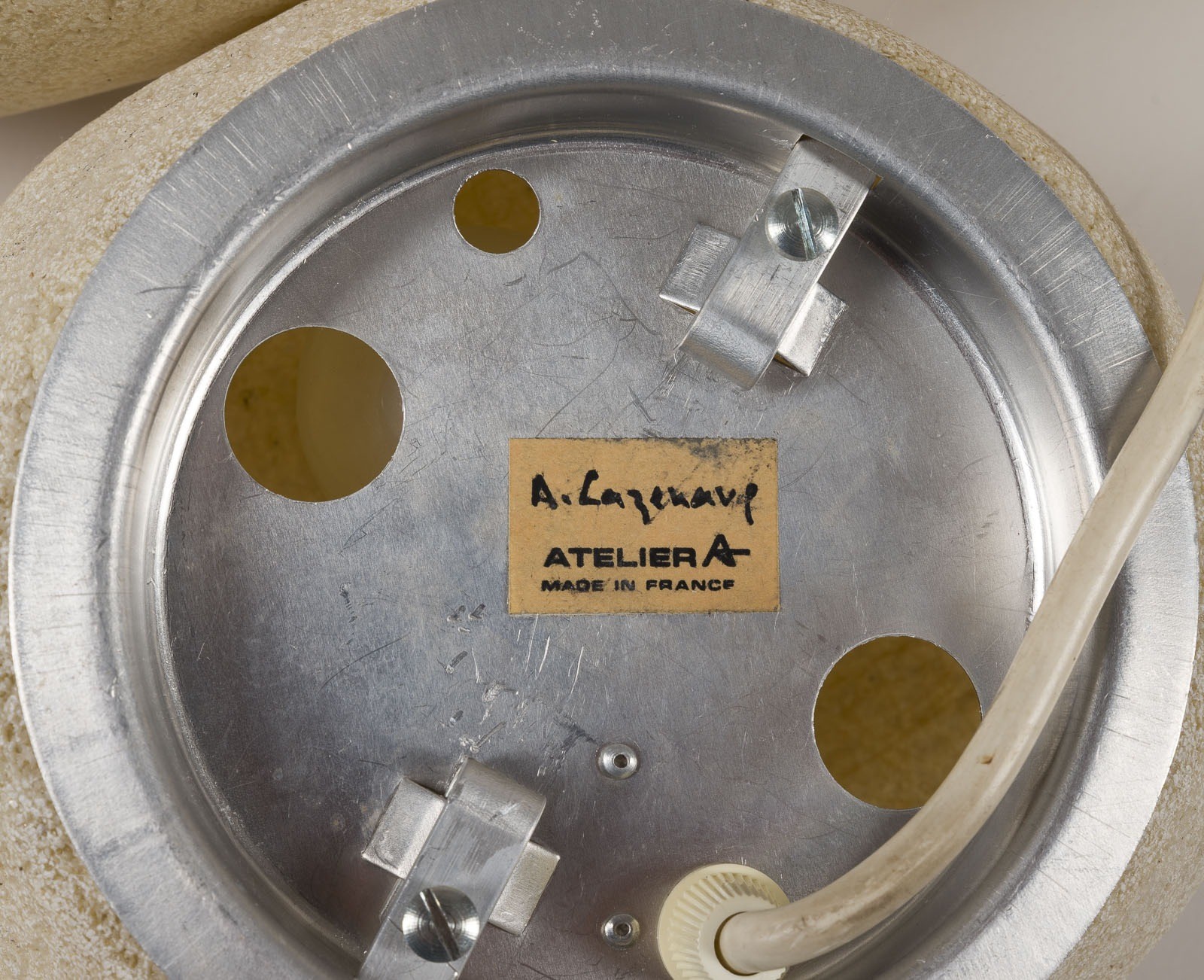 ANDRE CAZENAVE 1928 - 2003 SET OF THREE 'DORRA' LAMPS France, Atelier A, designed in 1969 Glass fiber reinforced polyester, marble powder, aluminium, each single-light electrified.. H.approx. 13,5 / 21 / 23 cm, D. max. approx. 18 / 27 / 28 cm. Each marked underneath 'A.Cazenave - ATELIER A - MADE IN FRANCE' (label). Light traces of use.