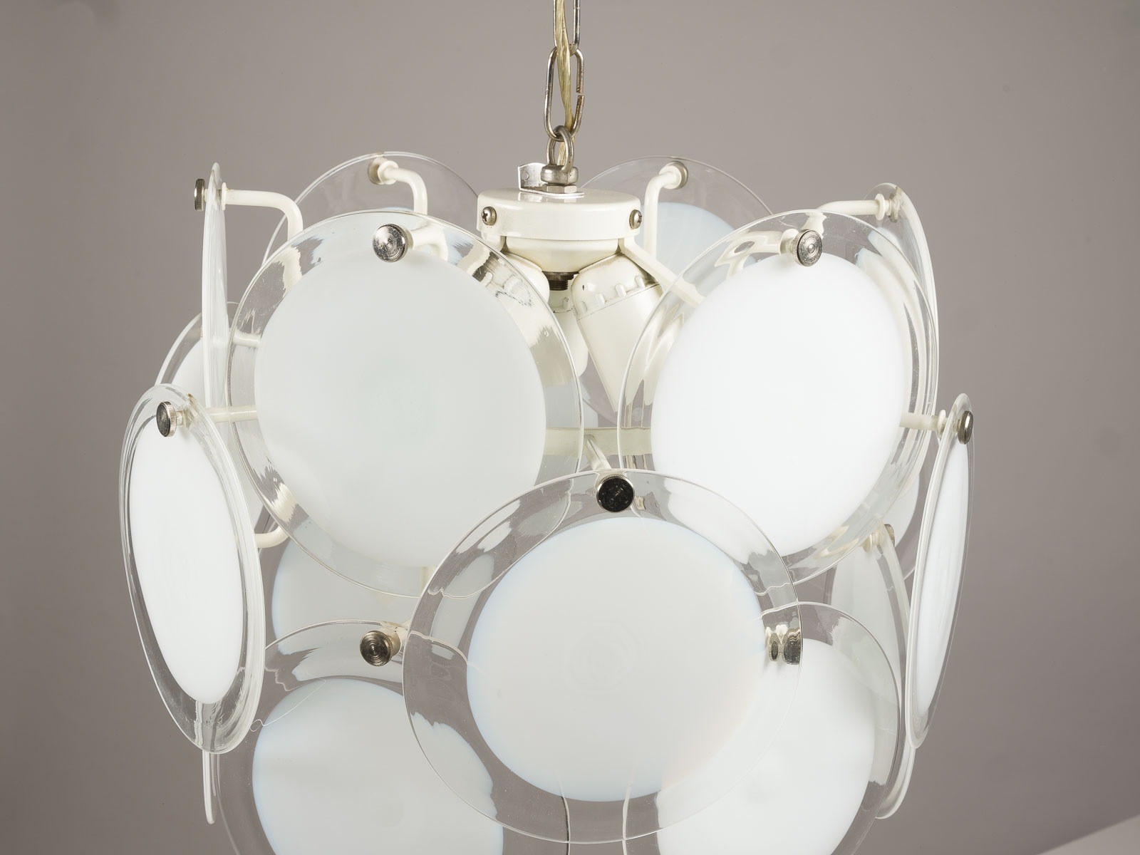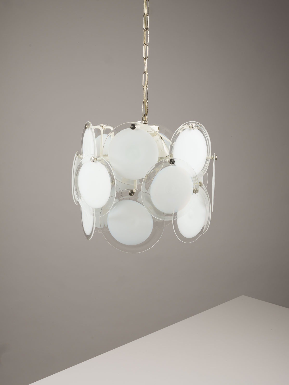 VISTOSI (ATTR.) Murano PENDANT LIGHT Italy, Murano, most likely Vistosi, around 1965 Chrome-plated and lacquered metal, white glass with colourless overlay, triple-light electrified, some replacement glass elements included. L. 100 cm, D. approx.. 36 cm. Light traces of age related wear.