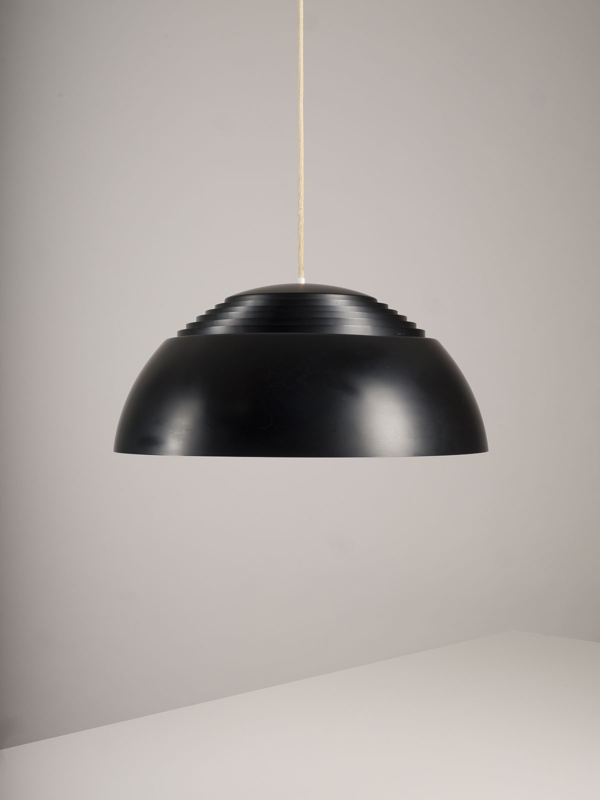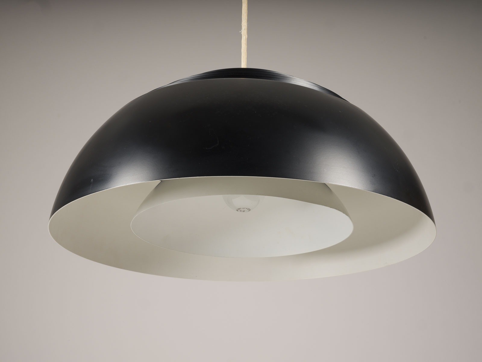 ARNE JACOBSEN 1902 Copenhagen - 1971 ibid. 'AJ ROYAL' PENDANT LAMP Denmark, Louis Poulsen, Design of 1958 Lacquered steel and aluminium, black, inside white, 4-light electrified. H.23 cm, D. 50 cm, L. 150 cm. Marked 'louis poulsen TYPE 16554 made in dennmark' (label). The design was part of the corporate design concept realised by Arne Jacobsen for the SAS Royal Hotel in Copenhagen. Some minor signs of use.