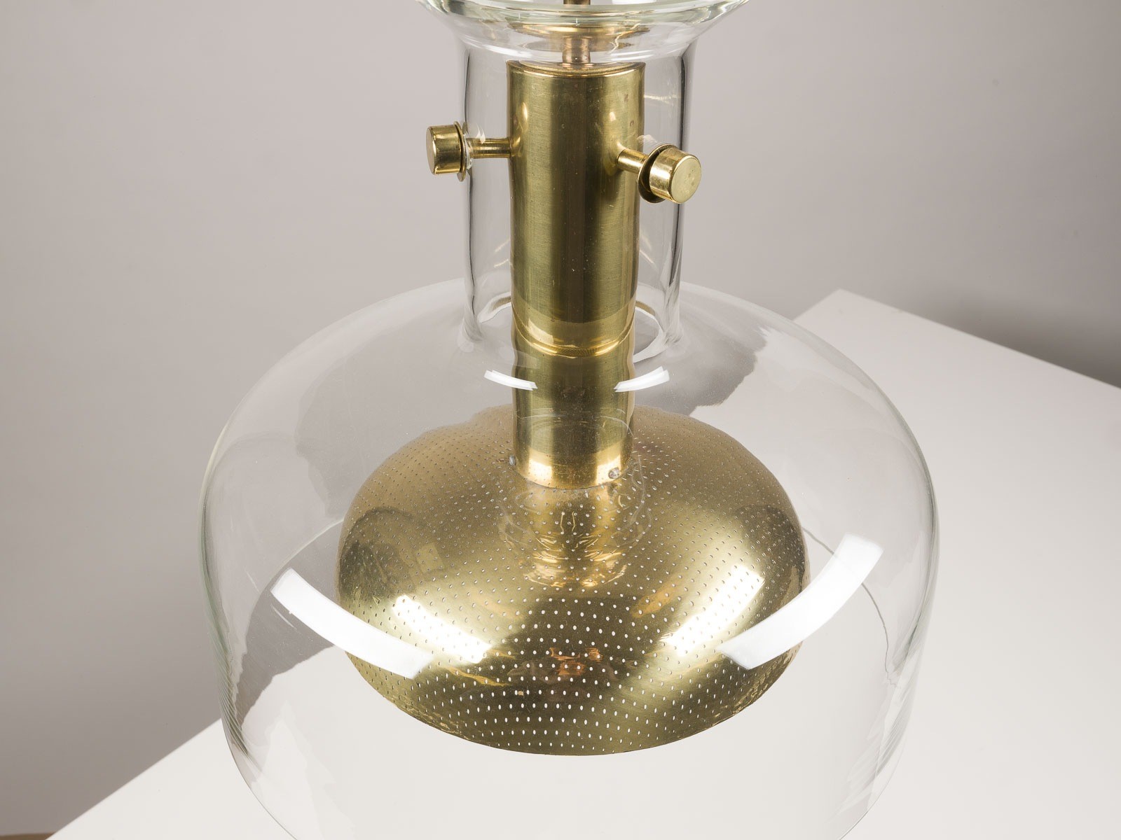 ANDERS PEHRSON 1912 Göteborg - 1982 'CRYSTAL' PENDANT LAMP Sweden, Atelje Lyktan, Åhus, Design of 1970 Colourless glass, brass and brass sheet, single-light electrified. H. 33 cm, D. 32 cm, L. approx. 62 cm. Slight signs of wear, some min. chips.